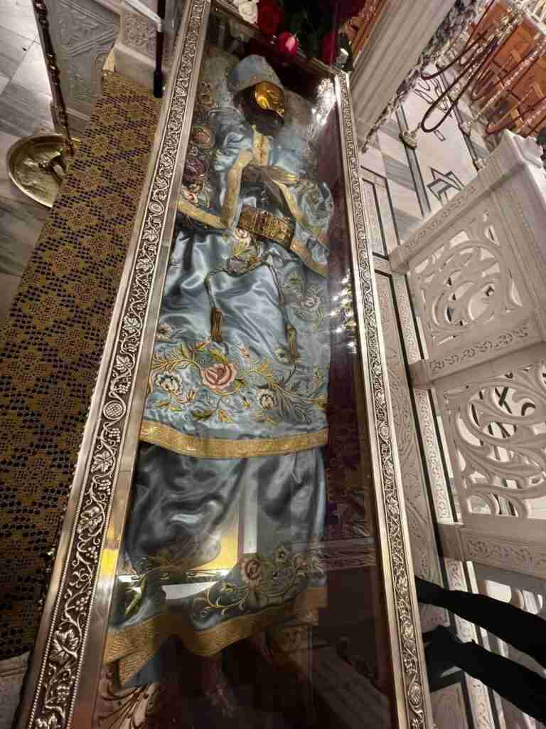 Έτσι με τη Βοήθεια και την καθοδήγηση του Άγιου, την Πέμπτη 18 Απρίλη 2024, κεκλεισμένων των θυρών, παρουσία του Σεβασμιώτατου Μητροπολίτη κ. Χρυσόστομου, έφτασε η Ιερή στιγμή που πραγματοποιήθηκε η αλλαγή των γαλάζιων Αμφίων με τα καινούρια χρυσοκέντητα και ροδοστολισμένα Λευκά Άμφια.