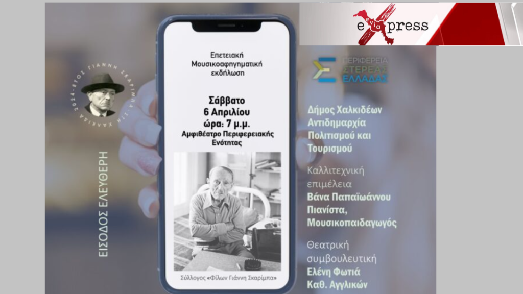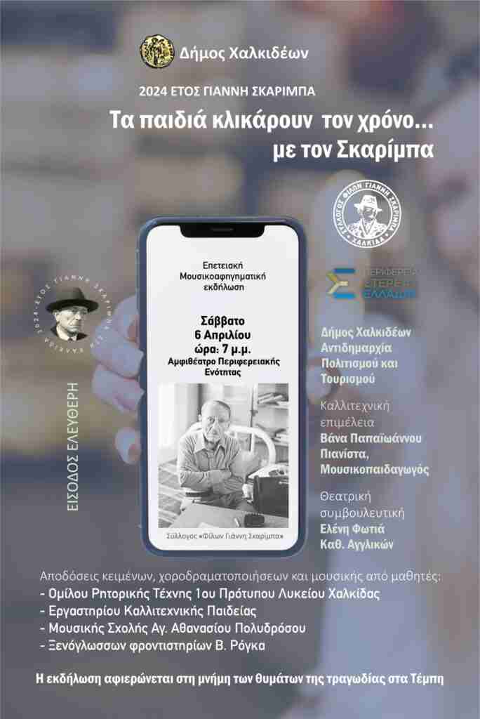Οι τιμητικές εκδηλώσεις συνεχίζονται από τον Σύλλογο Φίλων του Γιάννη Σκαρίμπα στη Χαλκίδα, σε συνεργασία με την Περιφέρεια Στερεάς Ελλάδας και τον Δήμο Χαλκιδέων, μέσα στο πλαίσιο του επετειακού έτους “2024 ΕΤΟΣ ΓΙΑΝΝΗ ΣΚΑΡΙΜΠΑ” με αφορμή την συμπλήρωση 40 ετών από το 1984 που άφησε τα εγκόσμια και πέρασε στο πάνθεο της αιωνιότητας.
