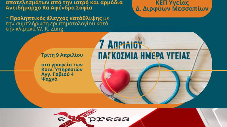 Το «Βοήθεια στο σπίτι» μέσω του ΚΕΠ Υγείας του Δ. Διρφύων Μεσσαπίων με αφορμή την Παγκόσμια Ημέρα Υγείας, θα πραγματοποιήσει την Τρίτη 9 Απριλίου 2024 και ώρες 9:00-14:00, στα γραφεία Κοινωνικών Υπηρεσιών, Αγγ. Γοβιού 4 στα Ψαχνά, μια σειρά δράσεων και προληπτικών εξετάσεων προκειμένου να τιμήσει αυτή την σπουδαία ημέρα αλλά και να συμβάλλει στην προώθηση των αξιών της πρόληψης και της καλής υγείας των συμπολιτών μας.