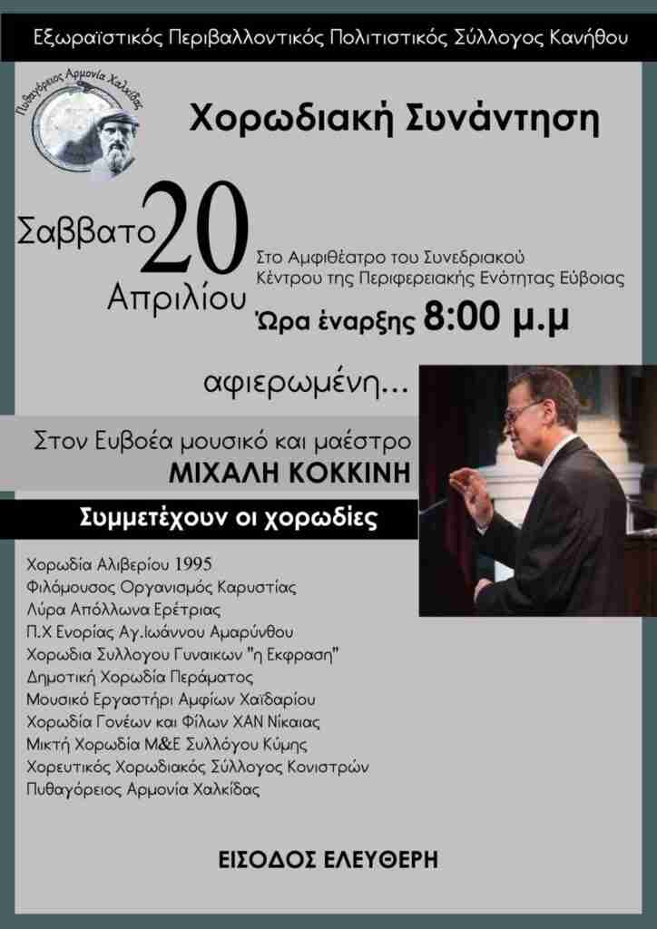 Η εκδήλωση αυτή είναι αφιερωμένη στον σπουδαίο Ευβοέα Μουσικό και Μαέστρο κύριο Μιχάλη Κοκκίνη .