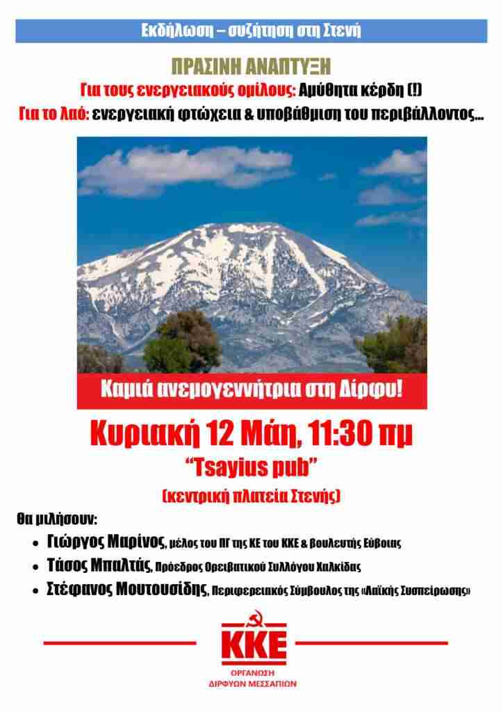 Την Κυριακή 12 Μαΐου η Κομματική Οργάνωση Διρφύων – Μεσσαπίων του ΚΚΕ διοργανώνει εκδήλωση συζήτηση στη Στενή με θέμα “ΠΡΑΣΙΝΗ ΑΝΑΠΤΥΞΗ“. Σημείο αναφοράς αποτελούν οι ενεργειακοί όμιλοι και τα αμύθητα κέρδη καθώς και η συνέπεια τους προς το λαό και η υποβάθμιση του περιβάλλοντος. Αίτημα τους είναι να μην εγκατασταθούν ανεμογεννήτριες στη Δίρφυ.