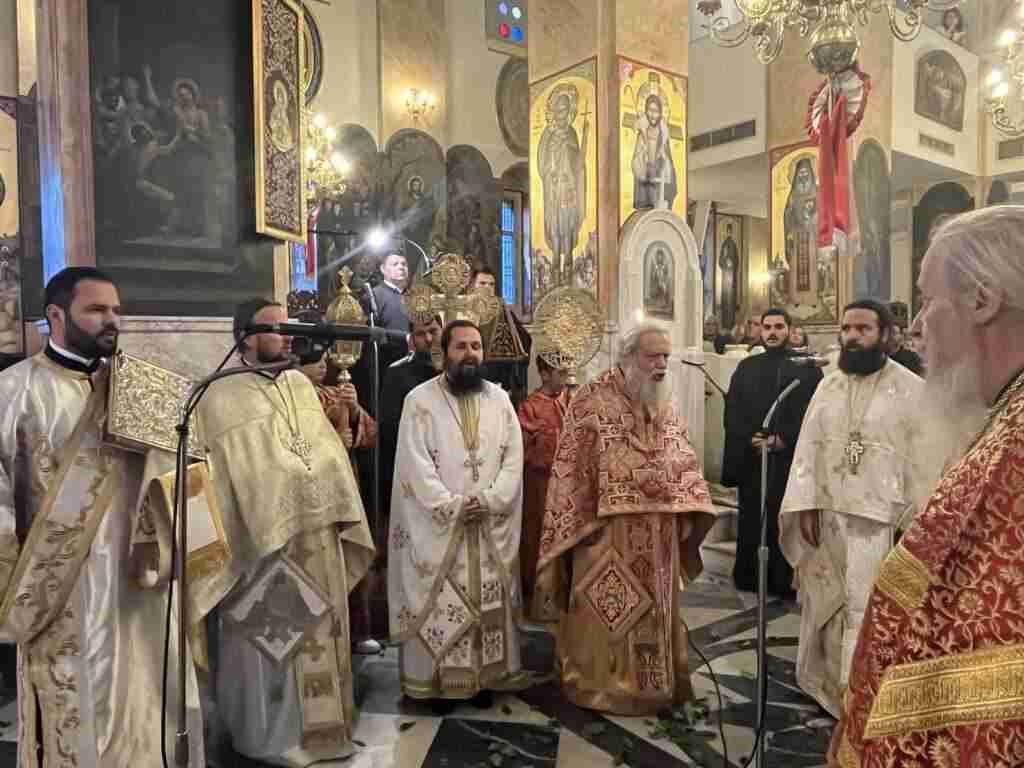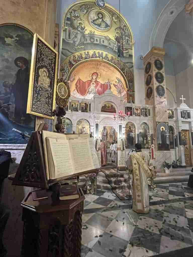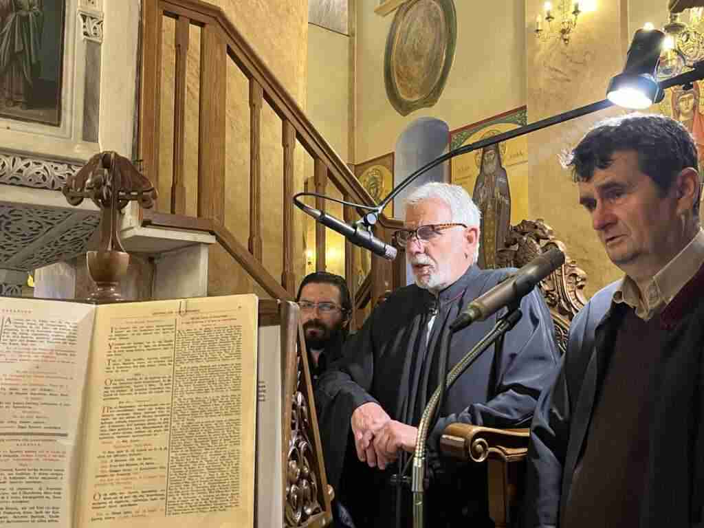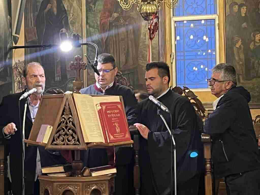 Στο δεξιό αναλόγιο έψαλλαν ο πρωτοψάλτης του Μητροπολιτικού Ναού Αγίου Γεωργίου κ. Χαράλαμπος Μαζαράκης, ο κ. Γεώργιος Σαλταρίκος και ο ιεροψάλτης αναγνώστης της Μητροπόλεως κ. Αναστάσιος Ρέτσας. Στο αριστερό αναλόγιο έψαλλε ο κ. Αντώνιος Κακαράτζας και ο κ. Δημήτρης Κουβέλης.