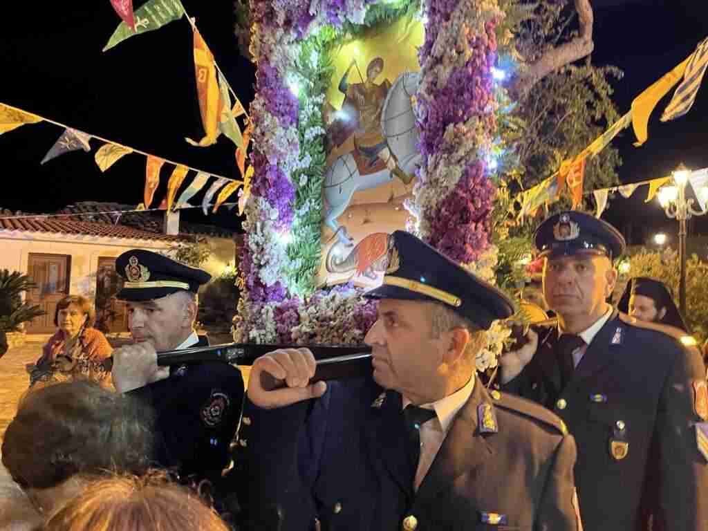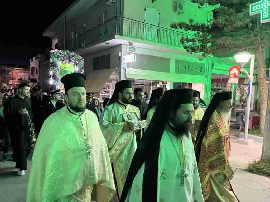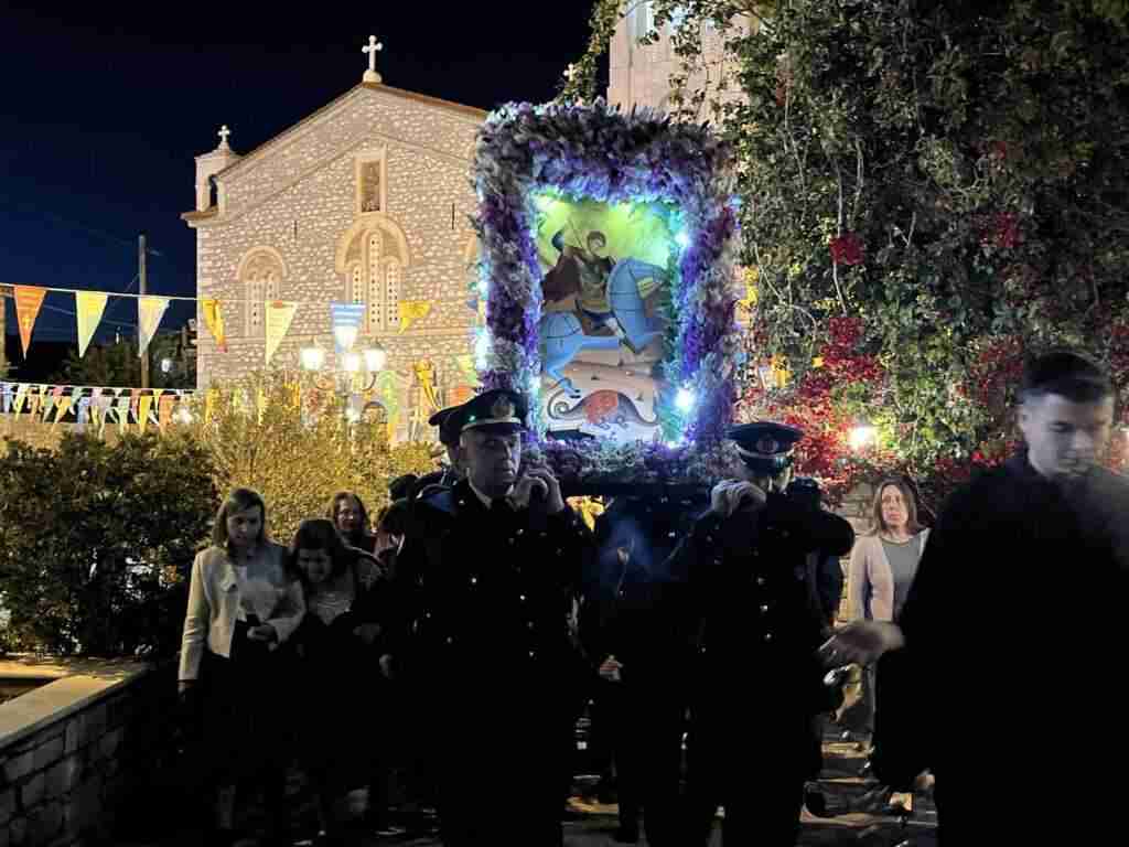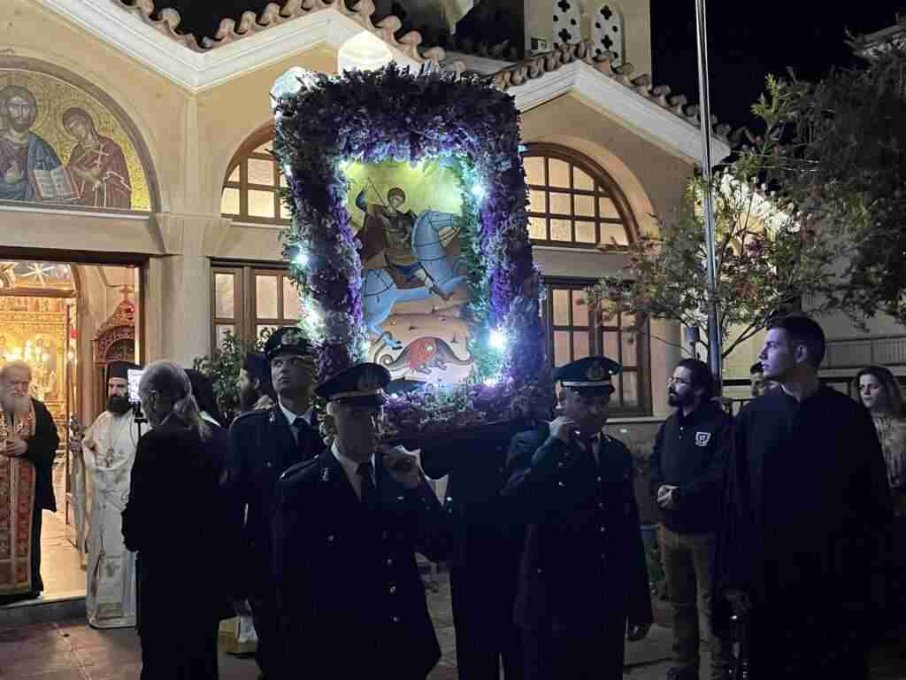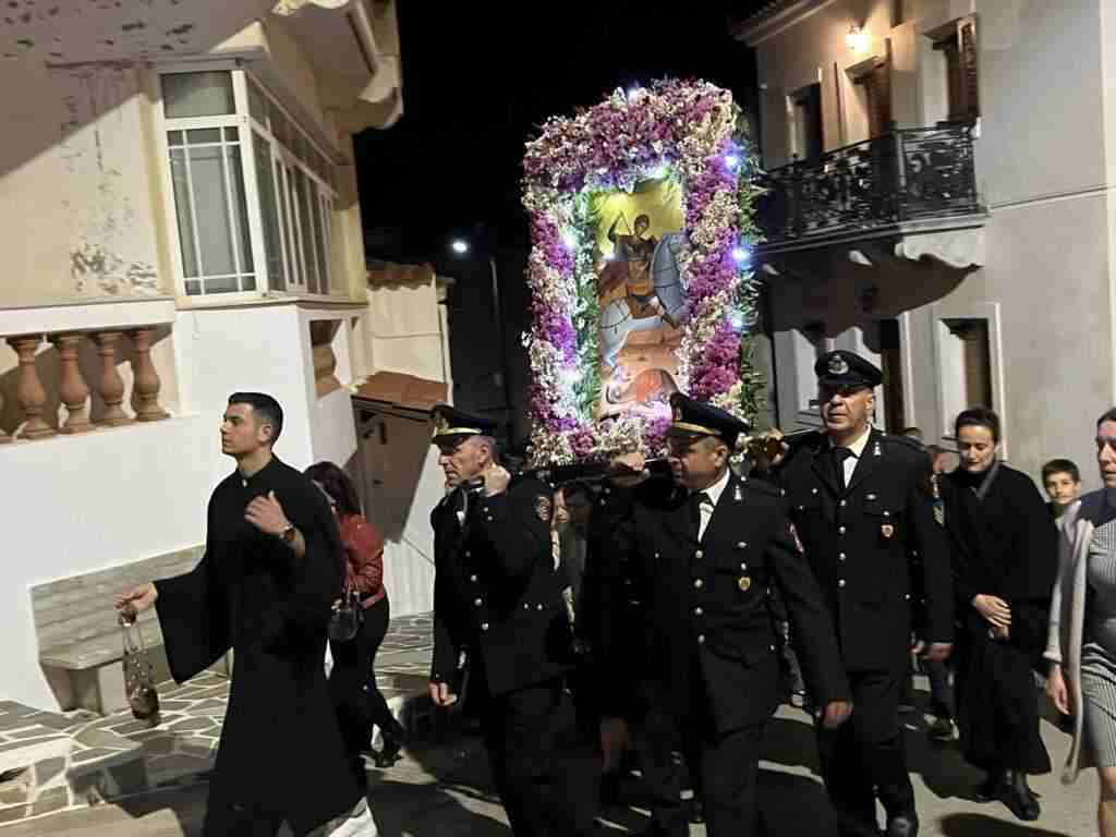 Ακολούθησε η λιτανεία της Εικόνας και τμήματος των Ιερών Λειψάνων του Αγίου Γεωργίου στους δρόμους της πόλης, συνοδευόμενη από πλήθος πιστών καθώς επίσης από παραδοσιακά ντυμένους άνδρες και γυναίκες του Πνευματικού Κέντρου Αλιβερίου ” Ο Άγιος Γεώργιος” καθώς και ο Πρόεδρος της Κοινότητας Αλιβερίου κ. Προκόπιος Αλέξης.