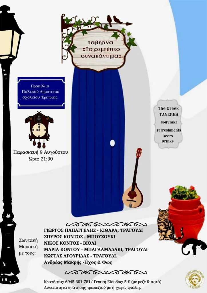 Tην Παρασκευή 9 Αυγούστου, με υπέροχο σκηνικό το παλιό Δημοτικό Σχολείο της Ερέτριας, ξανασμίγει η παρέα μας με ένα ρεμπέτικο πρόγραμμα που ξεκινάει από τη Σμυρναίικη σχολή, περνάει στην Πειραιώτικη, και καταλήγει στα πρώιμα λαϊκά του Τσιτσάνη και του Καλδάρα.