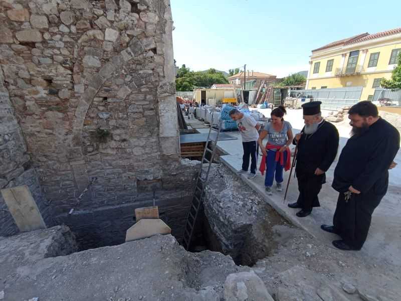 Ακολούθησε της ενημέρωσης ξενάγηση-παρουσίαση του ανασκαφικού έργου που εκτελείται στον περιβάλλοντα χώρο του Ι. Ναού καθώς και των έργων αποκατάστασης που συνεχίζονται στο εσωτερικό του.