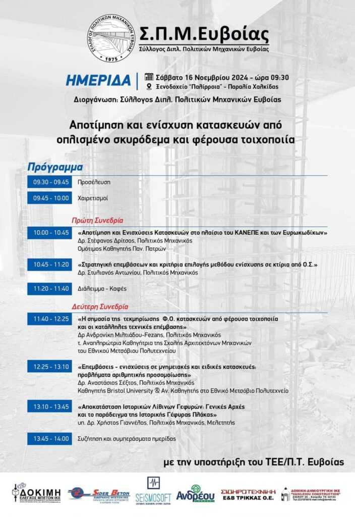 Ο Σύλλογος Διπλωματούχων Πολιτικών Μηχανικών Ευβοίας πραγματοποιεί ΕΠΙΣΤΗΜΟΝΙΚΗ ΗΜΕΡΙΔΑ το Σάββατο 16 Νοεμβρίου στις 9.30 το πρωί με θέμα: την “Αποτίμηση κ´ Ενίσχυση Κατασκευών από Οπλισμένο Σκυρόδεμα και από Φέρουσα Τοιχοποιία”.