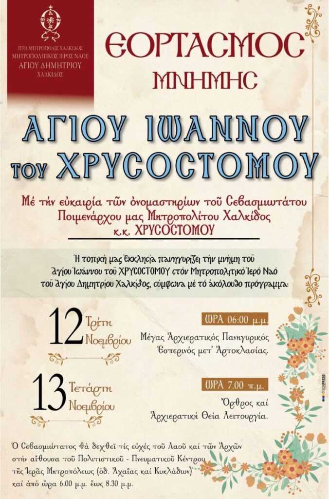 Ευχαρίστως ανακοινώνεται ότι, με αφορμή τον πανηγυρικό εορτασμό της μνήμης του Αγίου Ιωάννου του Χρυσοστόμου, κατά την οποία εορτάζει και ο Σεβασμιώτατος Ποιμενάρχης μας, Μητροπολίτης Χαλκίδος κ. ΧΡΥΣΟΣΤΟΜΟΣ, θα λάβουν χώρα οι κάτωθι Ιερές Ακολουθίες και Συνάξεις στον Μητροπολιτικό Ι. Ναό Αγίου Δημητρίου Χαλκίδος: