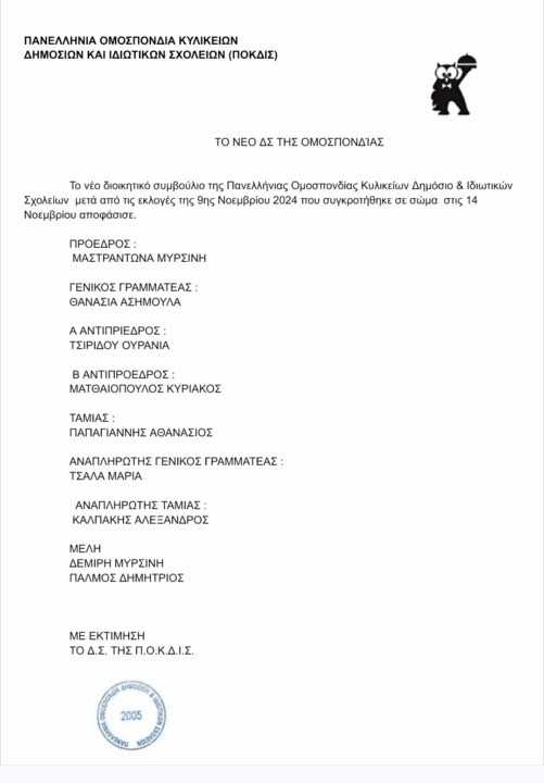 Νέο Διοικητικό Συμβούλιο στην Πανελλήνια Ομοσπονδία Κυλικείων Δημόσιων και Ιδιωτικών Σχολείων ανέδειξαν οι εκλογές της 9ης Νοεμβρίου 2024.