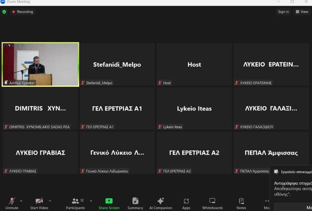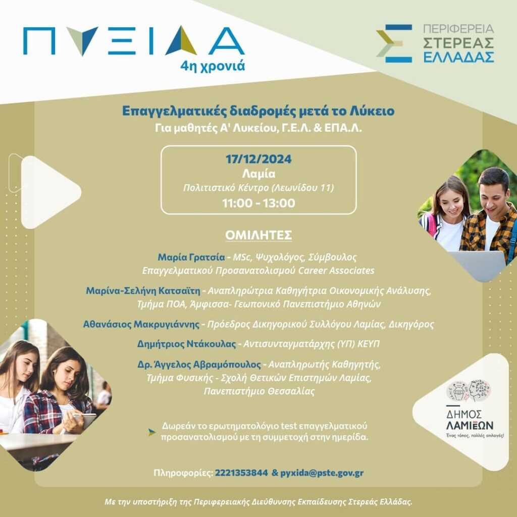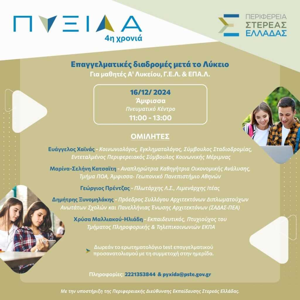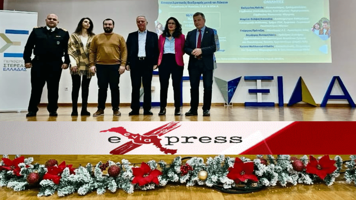 Σήμερα Δευτέρα 16 Δεκεμβρίου στην πόλη της Άμφισσας, ολοκληρώθηκε η 2η δια ζώσης ημερίδα επαγγελματικού προσανατολισμού «ΠΥΞΙΔΑ», την οποία όμως παρακολούθησαν και πολλά σχολεία της Εύβοιας διαδικτυακά, παρουσία του Αντιπεριφερειάρχη Παιδείας κου Αναστάσιου Βελισσαρίου.