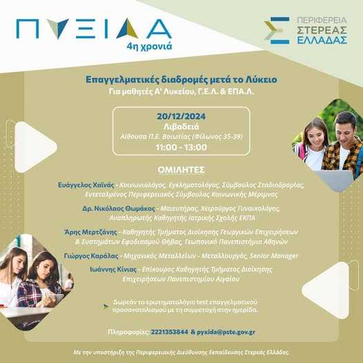 Ολοκληρώθηκαν το τριήμερο που πέρασε, 18, 19 και 20 Δεκεμβρίου, οι διά ζώσης ημερίδες επαγγελματικού προσανατολισμού με την υποστήριξη της Περιφερειακής Διεύθυνσης Εκπαίδευσης Στερεάς Ελλάδας, του προγράμματος «ΠΥΞΙΔΑ» στο Καρπενήσι, στην Θήβα και στην Λιβαδειά.