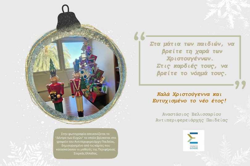 Ένα διαφορετικό Χριστουγεννιάτικο Δέντρο κοσμεί το Γραφείο του Αντιπεριφερειάρχη Παιδείας κου. Αναστάσιου Βελισσαρίου. Στα φύλλα του είναι γραμμένες οι πιο γλυκές ευχές από μαθητές και μαθήτριες της Περιφέρειας Στερεάς Ελλάδας, στολίδια του είναι οι κάρτες που κατασκεύασαν τα παιδιά, με τον πηγαίο αυθορμητισμό τους , με την σπίθα της αναζήτησης του καινούριου και του διαφορετικού στο πνεύμα τους, με την αστείρευτη ενέργεια που δύσκολα περιορίζεται …κι ας είναι “Στα μάτια των παιδιών να βρείτε τη χαρά των Χριστουγέννων …και στις καρδιές τους να βρείτε το νόημα τους “ εύχεται για τα Χριστούγεννα και το Νέο Έτος ο Αντιπεριφερειάρχης κ. Βελισσαρίου.