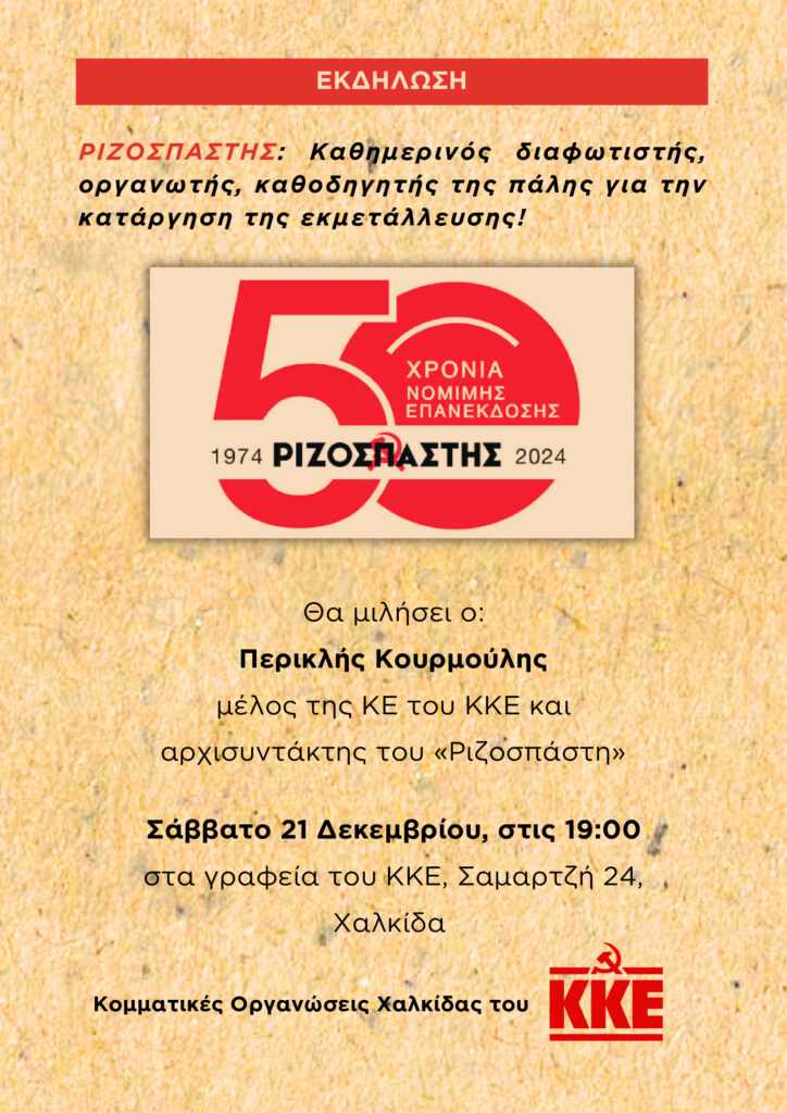 Οι Κομματικές Οργανώσεις Χαλκίδας του ΚΚΕ, με αφορμή τη συμπλήρωση 50 χρόνων από την νόμιμη επανέκδοση του “Ριζοσπάστη” διοργανώνουν εκδήλωση με θέμα:
