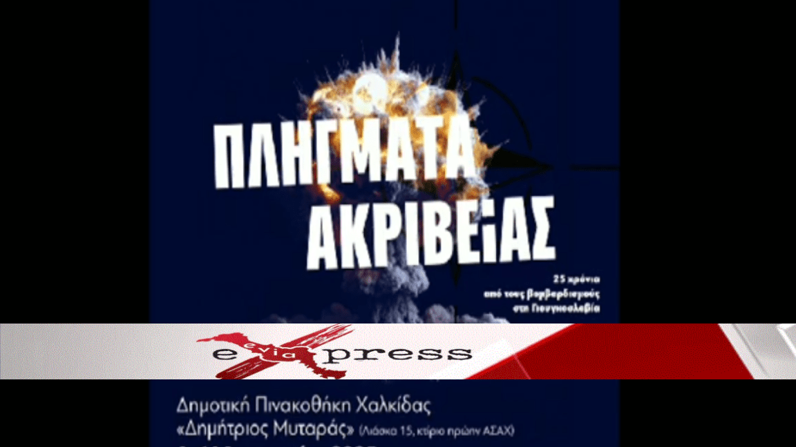 Η Αντιπολεμική Εικαστική Έκθεση με θέμα “Πλήγματα Ακρίβειας”, ανοίγει τις πύλες της με τα εγκαίνια που θα πραγματοποιηθούν το Σάββατο 4 Ιανουαρίου στις 6:00 η ώρα το απόγευμα, στη Δημοτική Πινακοθήκη Χαλκίδας.