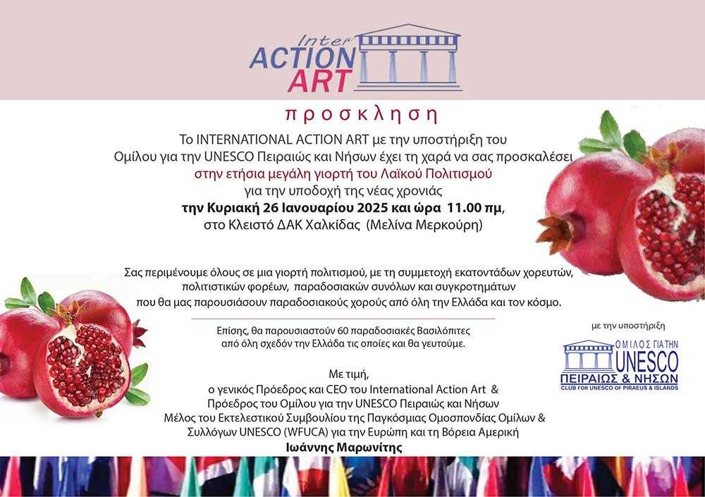Την κορυφαία εκδήλωση παράδοσης και πολιτισμού διοργανώνει ο οργανισμός International Action Art, με την υποστήριξη του Ομίλου για την UNESCO Πειραιώς και Νήσων