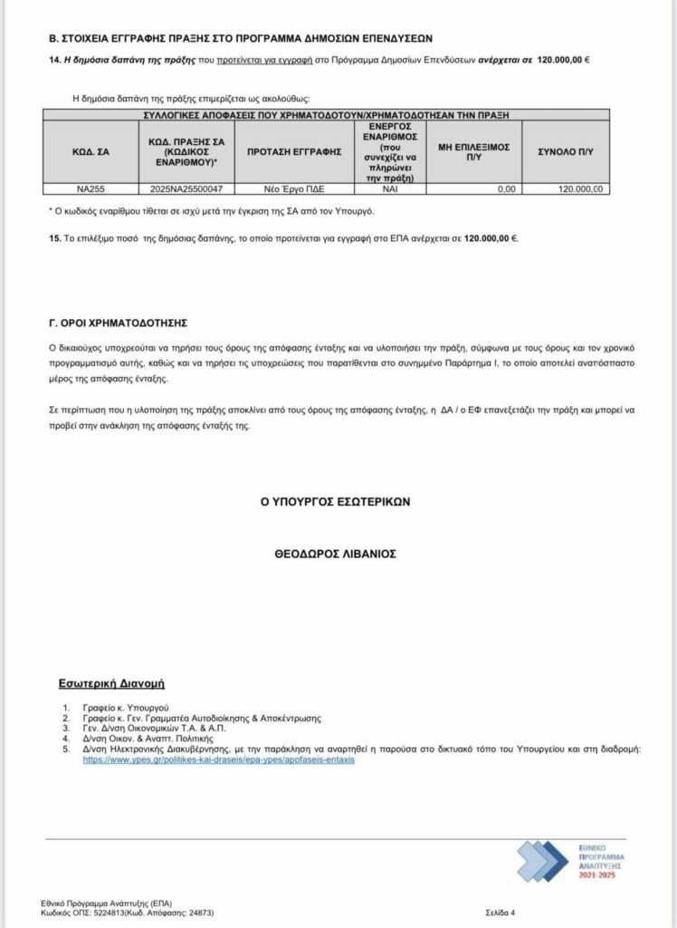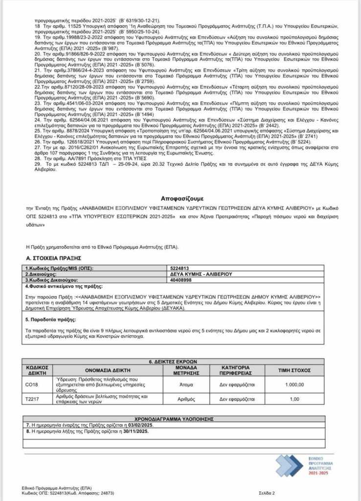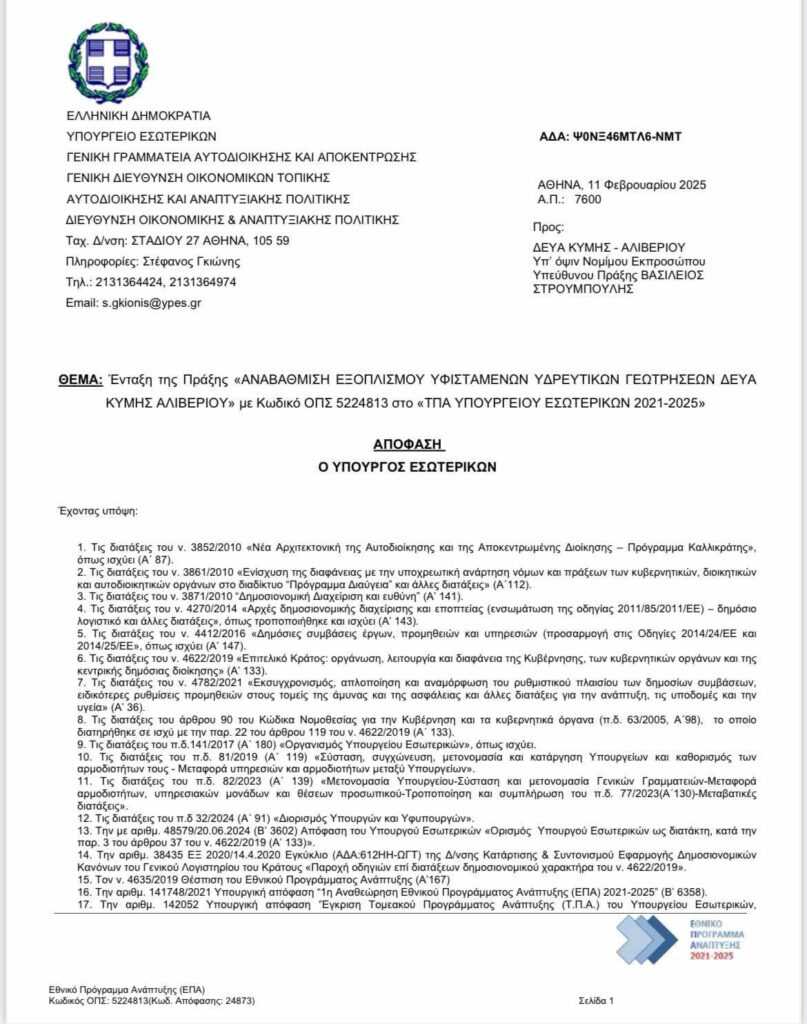 Με απόφαση του Υπουργού Εσωτερικών, κ. Λιβάνιου εγκρίθηκε η πράξη με τίτλο «Αναβάθμιση εξοπλισμού υφιστάμενων υδρευτικών γεωτρήσεων ΔΕΥΑ Κύμης Αλιβερίου». Το έργο έχει προϋπολογισμό 120.000 ευρώ και χρηματοδοτείται από το Εθνικό Πρόγραμμα Ανάπτυξης (ΕΠΑ).