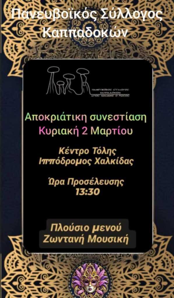 Μέσα στην δύση της καθημερινότητας ο Πανευβοϊκός Σύλλογος Καππαδοκών ετοιμάζει ένα μεγάλο αποκριάτικο γλέντι . Η πρόσκληση είναι ανοιχτή για όσους θέλουν να διασκεδάσουν, να χορέψουν και να ξεφαντώσουν. Ραντεβού την Κυριακή 2 Μαρτίου στο κέντρο Τόλης στην περιοχή του Ιπποδρόμου, στις 13:30.