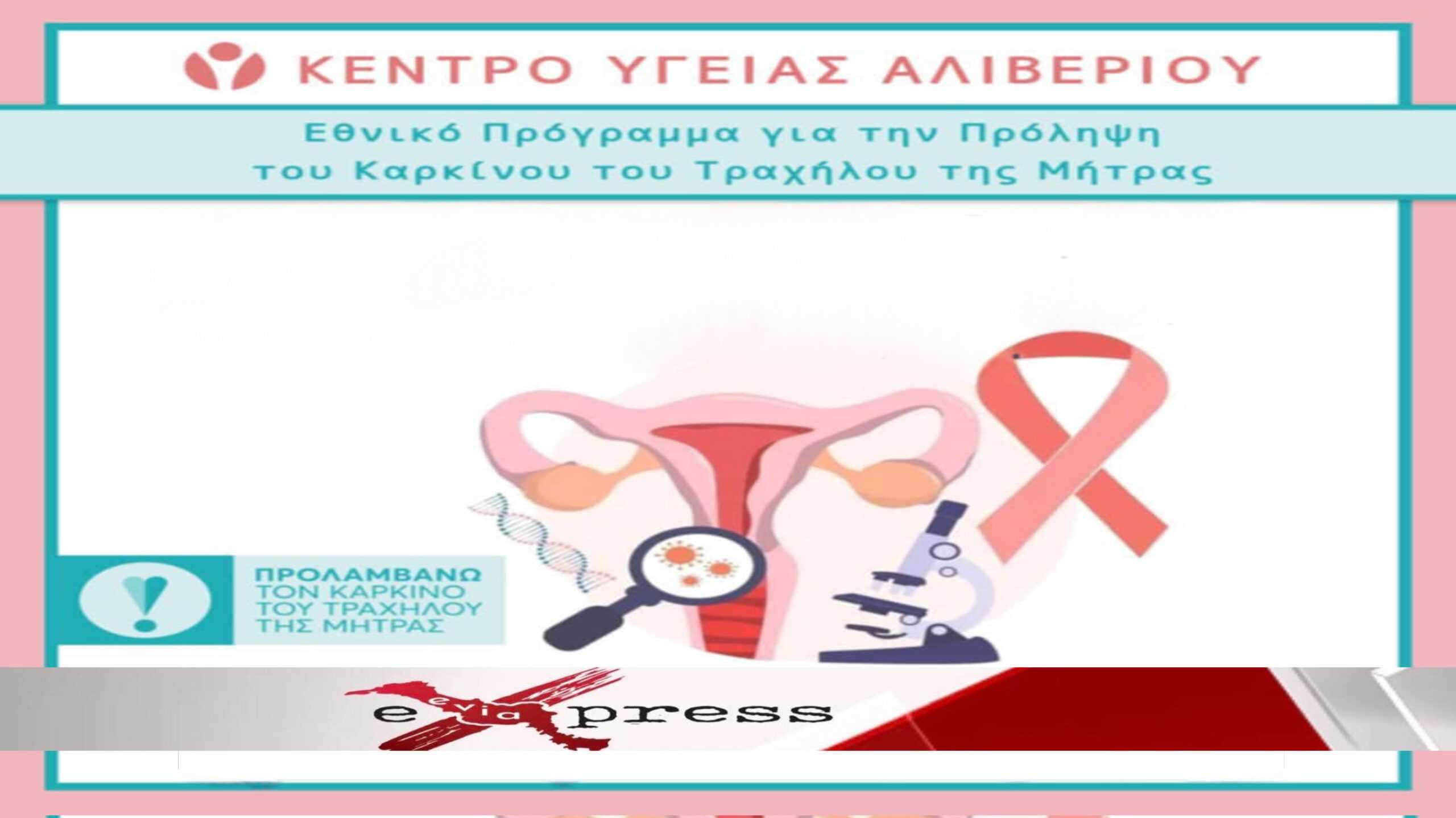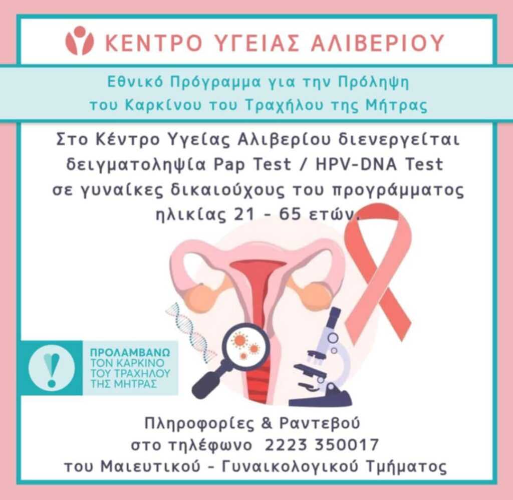Στα πλαίσια του Εθνικού Προγράμματος για την Πρόληψη του Καρκίνου του Τραχήλου της Μήτρας στο Κέντρο Υγείας Αλιβερίου διενεργείται δειγματοληψία ΠΑΠ τεστ και HPV – DNA τεστ για γυναίκες από 21 έως 65 ετών.