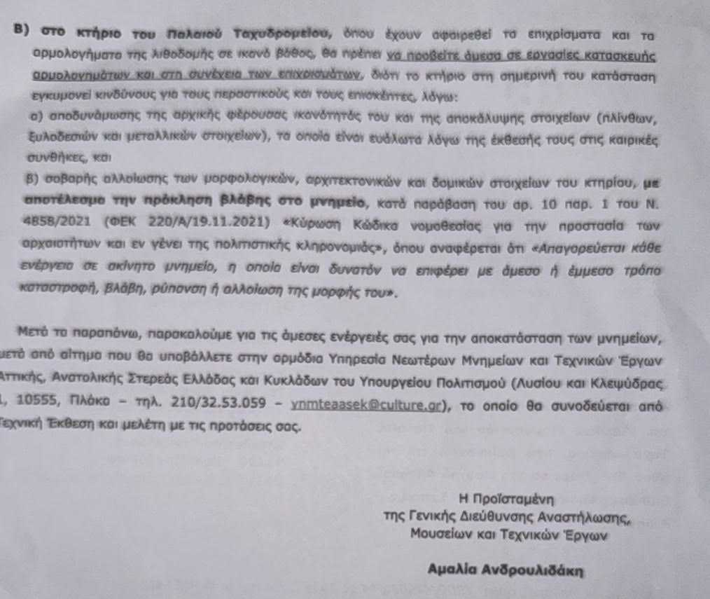 Επιπλέον, αναφορικά με το κτήριο του Παλαιού Ταχυδρομείου, το ΥΠΠΟ ζητά, στο ίδιο έγγραφο (επισυνάπτεται), την άμεση πραγματοποίηση εργασιών -όπου έχουν αφαιρεθεί από αυτό τα επιχρίσματα και τα αρμολογήματα της λιθοδομής σε ικανό βάθος- σε εργασίες κατασκευής αρμολογημάτων και στη συνέχεια των επιχρισμάτων, διότι εγκυμονούνται κίνδυνοι για τους περαστικούς και τους επισκέπτες. Σύμφωνα με το Υπουργείο, οι εργασίες αυτές είναι απαραίτητες, διότι λόγω των επεμβάσεων έχει αποδυναμωθεί η φέρουσα ικανότητα του κτηρίου και στοιχεία που έχουν αποκαλυφθεί (πλίνθοι, ξυλοδεσιές, μεταλλικά στοιχεία) είναι ευάλωτα στις καιρικές συνθήκες, ενώ γενικά οι επεμβάσεις που έγιναν αλλοιώνουν τα μορφολογικά, αρχιτεκτονικά και δομικά στοιχεία του, με αποτέλεσμα την πρόκληση βλάβης στο μνημείο, κατά παράβαση του «Κώδικα νομοθεσίας για την προστασία των αρχαιοτήτων και εν γένει της πολιτιστικής κληρονομιάς» (ν. 4858/2021).