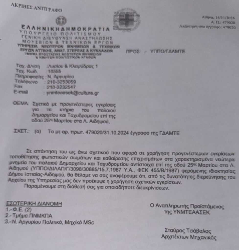 Συγκεκριμένα, το Υπουργείο Πολιτισμού, και συγκεκριμένα η «Γενική Διεύθυνση Αναστήλωσης, Μουσείων, και Τεχνικών Έργων», σε έγγραφό της (Α.Π. 514787, 20/11/2024) αναφέρει ότι ενημερώθηκε κατόπιν καταγγελίας για τις εν λόγω επεμβάσεις και τονίζει ότι η αρμόδια «Υπηρεσία Νεωτέρων Μνημείων και Τεχνικών Έργων Αττικής, Ανατ. Στερεάς και Κυκλάδων» δεν χορήγησε ποτέ εγκρίσεις για την πραγματοποίησή τους (Α.Π. 479020, 14/11/2024).