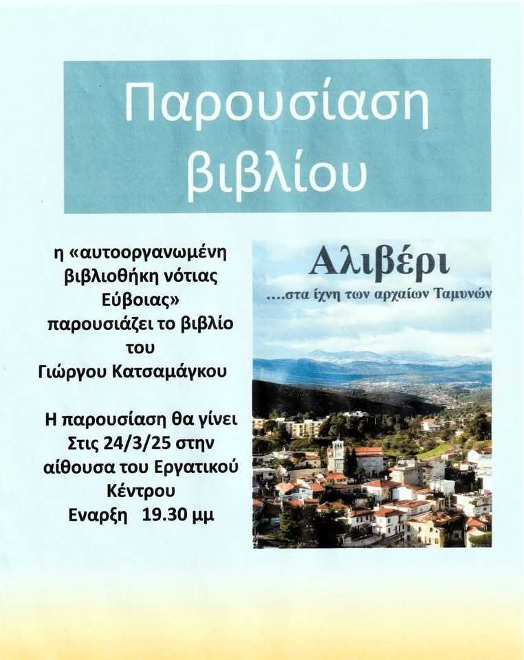 Η Αυτοοργανωμένη Βιβλιοθήκη της Νότιας Εύβοιας διοργάνωσε μια απολύτως άψογη εκδήλωση όπου παρουσιάστηκε για πρώτη φορά το νέο έργο του κου Γεώργιου Κατσαμάγκου, του οποίου δικαίως του αποδίδεται ο τίτλος του «ιστοριοδίφη» και μάλιστα κατέχει την πρώτη θέση με τις συγγραφές του, που αφορούν την εξιστόρηση μοναδικών, σπάνιων, τεκμηριωμένων στοιχείων από τις αρχαίες Ταμύναι μέχρι το σύγχρονο Αλιβέρι του Δήμου Κύμης Αλιβερίου.