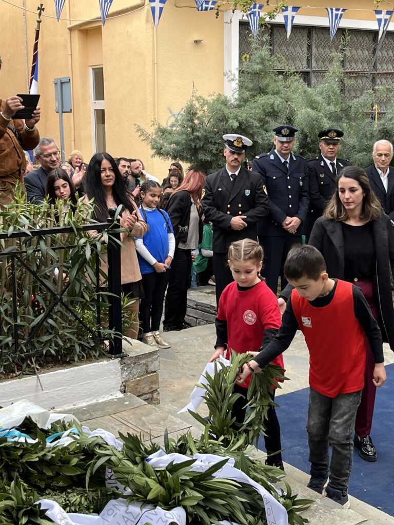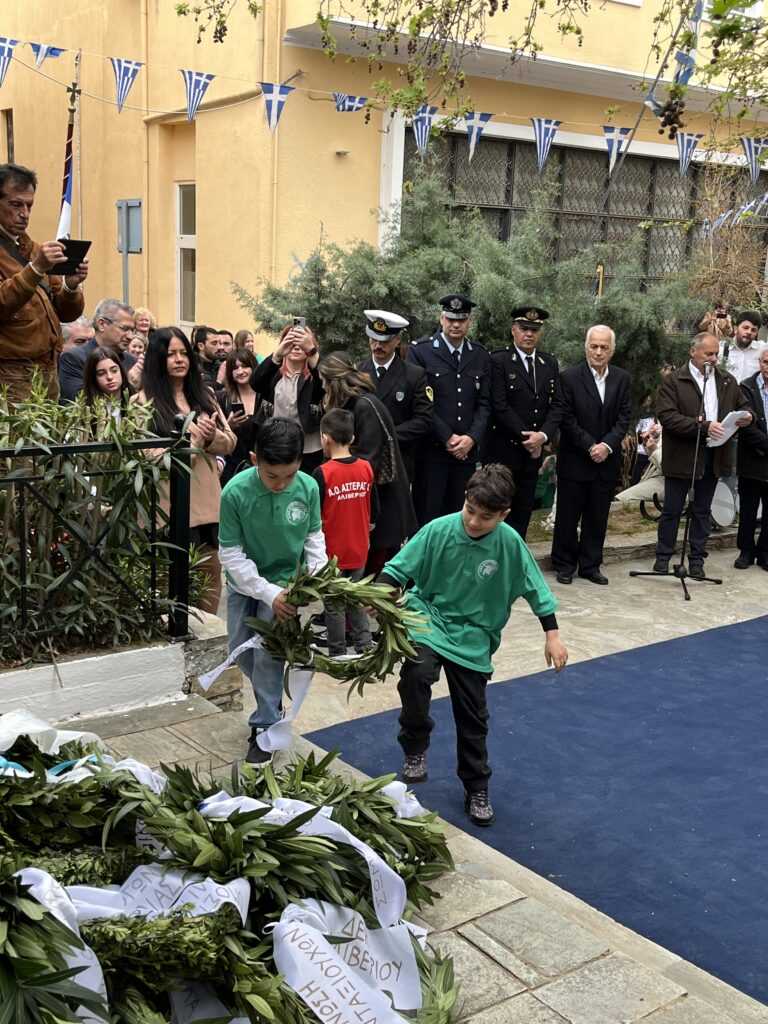 Κατόπιν της τηρήσεως ενός λεπτού σιγής ως ελάχιστος φόρος τιμής στη μνήμη των Πεσόντων, μαθητές από το Γυμνάσιο Αλιβερίου τραγούδησαν τον ΕΘΝΙΚΟ ΥΜΝΟ.