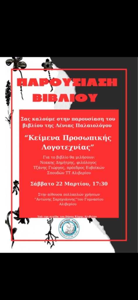 Με εξαιρετικό ενδιαφέρον παρουσιάστηκε το νέο βιβλίο της Λένιας Παλαιολόγου, στην γενέτειρά της το Αλιβέρι, το απόγευμα του Σαββάτου 22 Μαρτίου 2025, στην αίθουσα διαλέξεων του Γυμνασίου Αλιβερίου «Αντώνης Σαριγιάννης»,