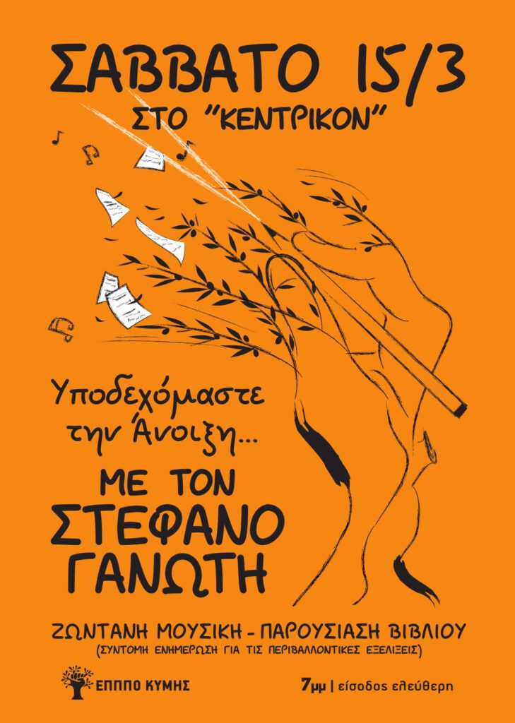 Σύντομη ενημέρωση για τα μεγάλα θέματα του περιβάλλοντος στην περιοχή του Δήμου Κύμης-Αλιβερίου και κυρίως μια βραδιά αφιερωμένη στον πολιτισμό, τον άνθρωπο και την δικαιοσύνη θα πραγματοποιηθεί το Σάββατο 15 Μαρτίου στις 7:00 .