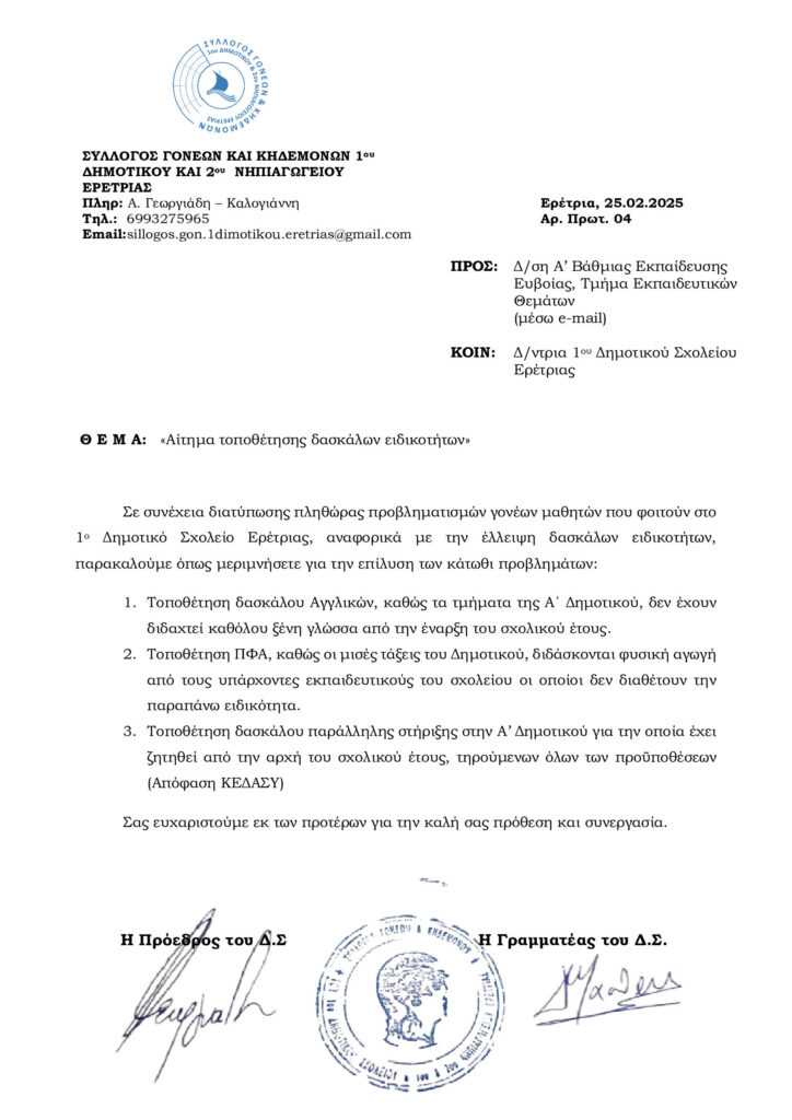 Καταθέτουμε ΑΝΑΦΟΡΑ την Επιστολή του Συλλόγου Γονέων και Κηδεμόνων 1ου Δημοτικού και 2ου Νηπιαγωγείου Ερέτριας, στην οποία ζητούν να καλυφθούν τα κενά σε εκπαιδευτικούς της Αγγλικής Γλώσσας, της Φυσικής Αγωγής και παράλληλης στήριξης.