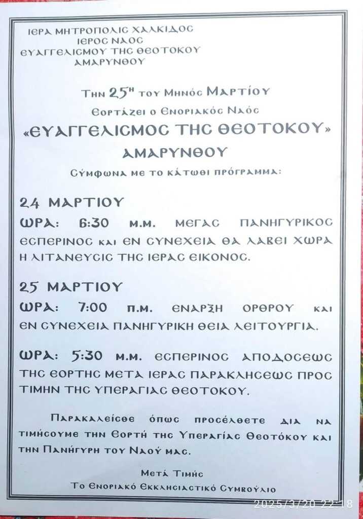 Την 25η Μαρτίου εορτάζει ο Ενοριακός Ναός «Ευαγγελισμός της Θεοτόκου» της Αμαρύνθου, την παραμονή της εορτής την Δευτέρα 24 Μαρτίου και ανήμερα 25 Μαρτίου 2025