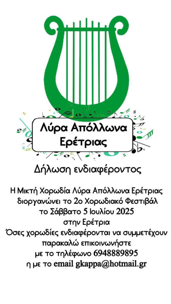 Διοργανώνεται το 2ο Χορωδιακό Φεστιβάλ Μικτής Χορωδίας Λύρα Απόλλωνα Ερέτριας που θα πραγματοποιηθεί το Σάββατο 5 Ιουλίου 2025.