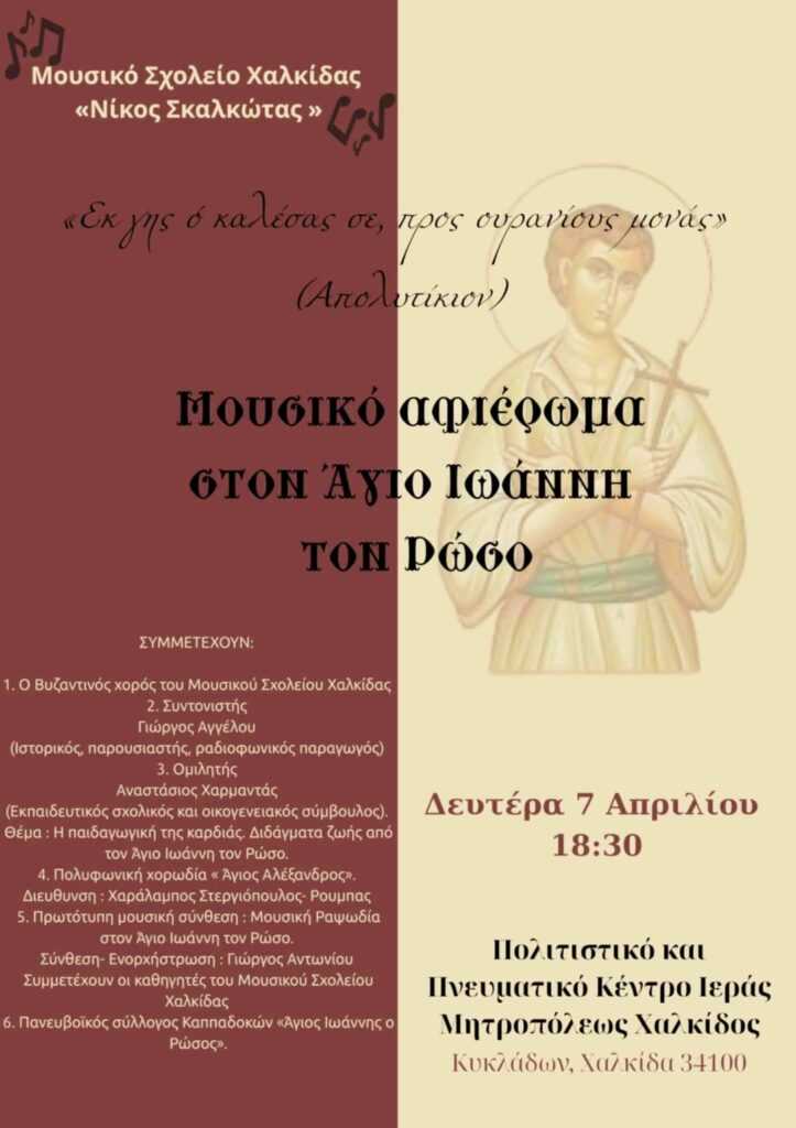 Μια ξεχωριστή εκδήλωση, αφιερωμένη στον Άγιο Ιωάννη τον Ρώσο, τον Άγιο της προσφυγιάς, θα πραγματοποιηθεί τη Δευτέρα 7 Απριλίου στις 18:30, στο Πολιτιστικό Πνευματικό Κέντρο της Ιεράς Μητροπόλεως Χαλκίδος.