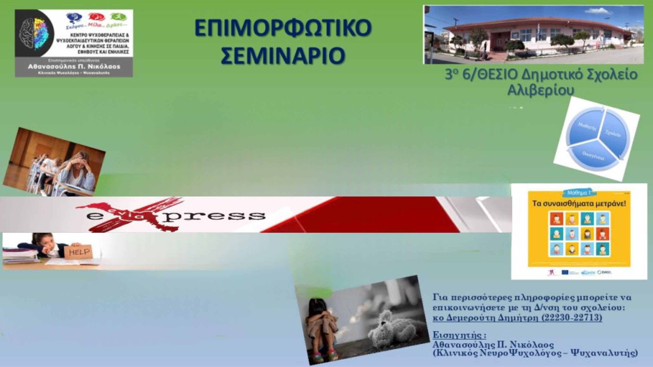 Το 3ο 6/θέσιο Δημοτικό Σχολείο Αλιβερίου, ο Διευθυντής κ. Δημήτρης Δεμερούτης και το εκπαιδευτικό προσωπικό, στην προσπάθειά του να ενισχύσει την ψυχική ανθεκτικότητα αλλά και να αντιμετωπίσει και να διαχειριστεί το παιδικό άγχος διοργανώνει ακόμη ένα επιμορφωτικό σεμινάριο για τους μαθητές (το τελευταίο για την φετινή σχολική χρονιά) την Πέμπτη 29 Μαΐου 2025 με καλεσμένο ομιλητή τον κ. Αθανασούλη Νικόλαο Ψυχολόγο, Ψυχαναλυτή.