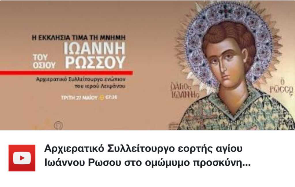 Μπορείτε να παρακολουθήσετε το σύνολο των ιερών ακολουθιών και τη λιτανεία, επιλέγοντας τον σύνδεσμο: Αρχιερατικό Συλλείτουργο εορτής αγίου Ιωάννου Ρωσου στο ομώμυμο προσκύνημα της Εύβοιας