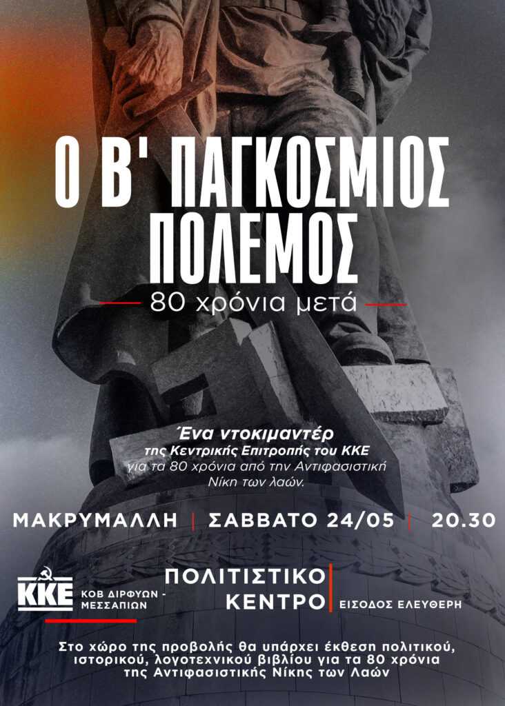 Συνεχίζονται οι εκδηλώσεις του ντοκιμαντέρ της ΚΕ του ΚΚΕ με τίτλο «Ο Β΄ Παγκόσμιος Πόλεμος – 80 χρόνια μετά» που πραγματοποιούν οι Κομματικές Οργανώσεις του ΚΚΕ στην Εύβοια με τη συμπλήρωση 80 χρόνων από την Αντιφασιστική Νίκη των Λαών. Μετά την προβολή στο πολιτιστικό κέντρο, στο Μακρυμάλλη Ψαχνών  από την ΚΟΒ Διρφύων Μεσσαπίων το Σάββατο 24 Μάη , επόμενες προβολές έχουν προγραμματιστεί για τη Δευτέρα 26 Μάη, στη Ν. Αρτάκη, στο Δημαρχείο, στις 19:00, από την ΚΟΒ Τροφίμων Ποτών και την Τετάρτη 28 Μάη, στην Κάρυστο , στο «Γιοκάλειο Ίδρυμα», στις 20:30, από την ΚΟΒ Καρύστου.