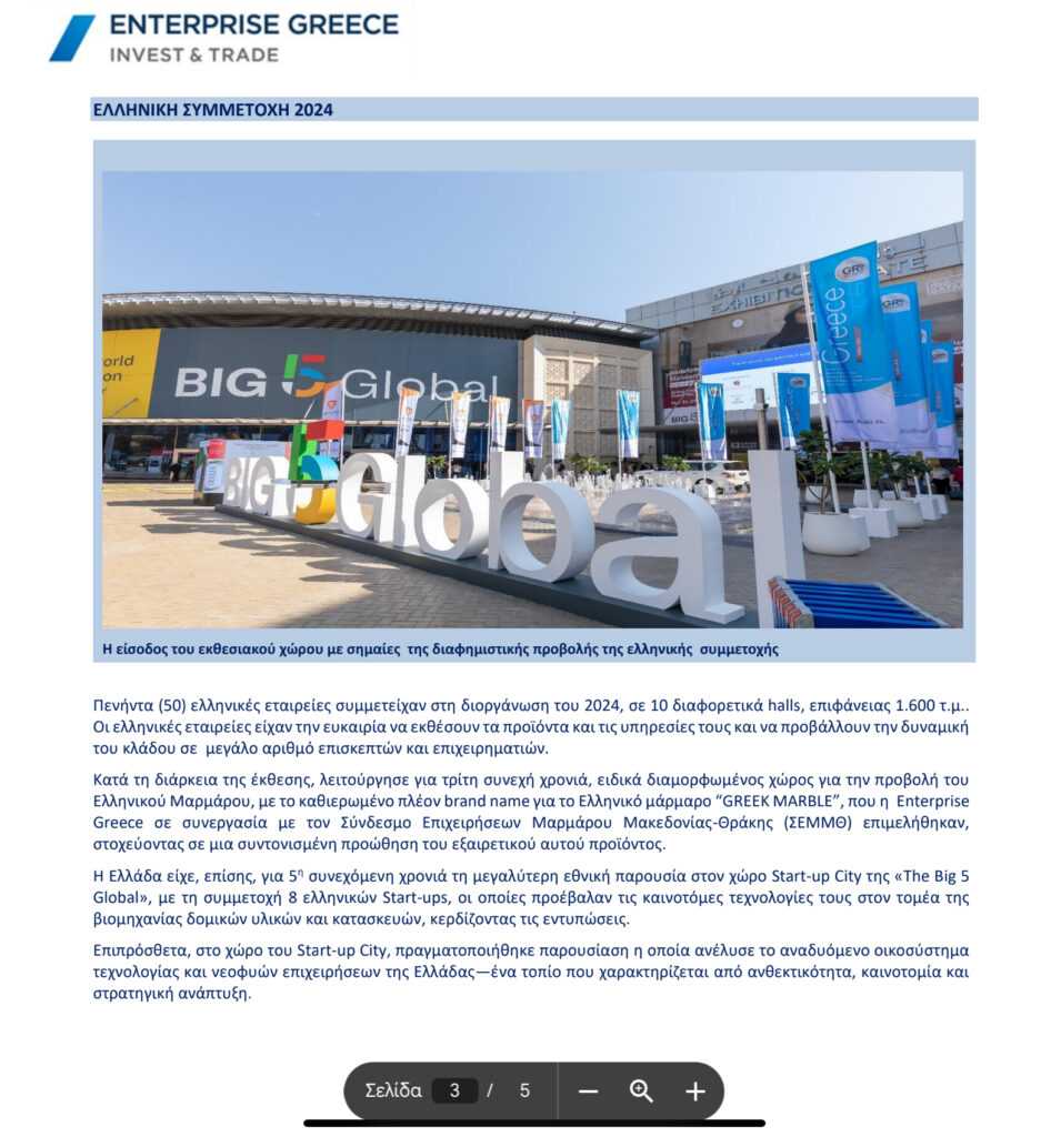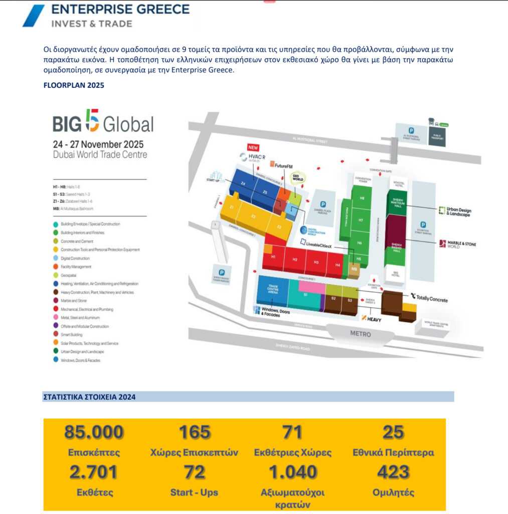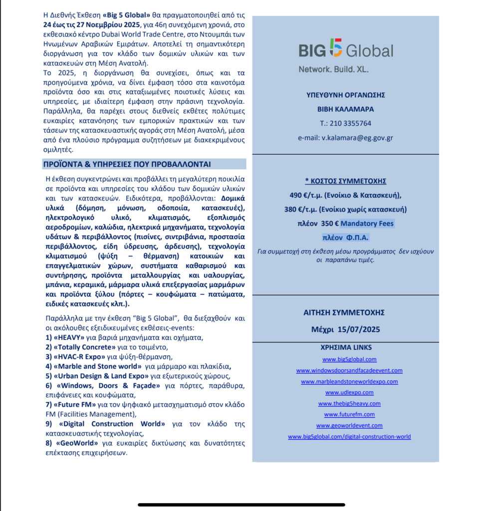 H Περιφέρεια Στερεάς Ελλάδας στο πλαίσιο της συνεργασίας της με την Ελληνική Εταιρεία Επενδύσεων & Εξωτερικού Εμπορίου Α.Ε. (ENTERPRISE GREECE) ανακοινώνει τη συμμετοχή της με το Εθνικό Περίπτερο στην Διεθνή Έκθεση δομικών υλικών «BIG 5 GLOBAL», που θα πραγματοποιηθεί για 46η χρονιά από τις 24 έως και τις 27 Νοεμβρίου 2025 στο Εκθεσιακό Κέντρο Dubai World Trade Centre, στο Ντουμπάι των Ηνωμένων Αραβικών Εμιράτων.