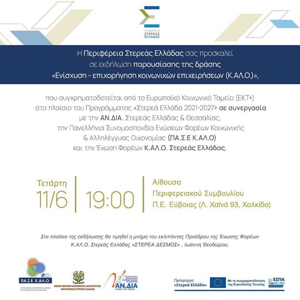 Την Τετάρτη 11 Ιουνίου η Περιφέρεια Στερεάς Ελλάδας πραγματοποιεί εκδήλωση για την «Ενίσχυση-επιχορήγηση κοινωνικών επιχειρήσεων (Κ.Α.Λ.Ο)»