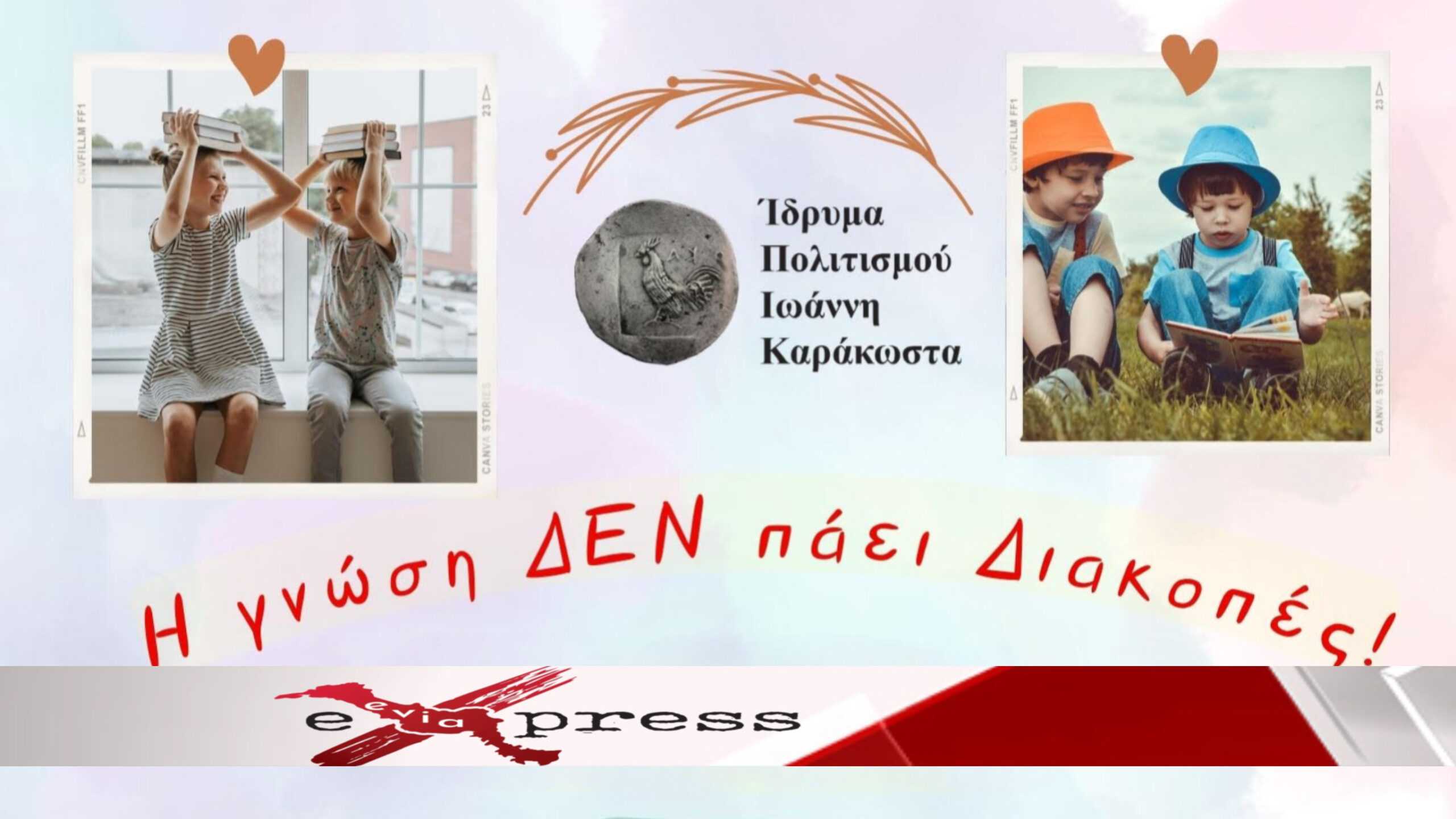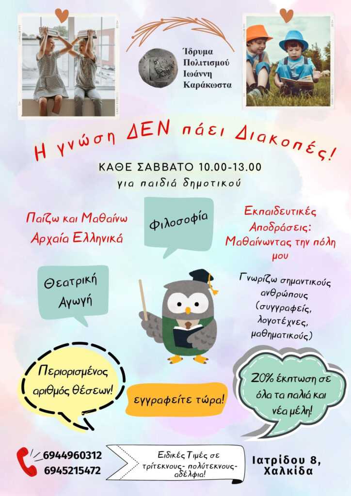 Κάθε Σάββατο στο κέντρο της πόλης, στο Ίδρυμα Πολιτισμού Ιωάννη Καράκωστα (Ιατρίδου 8, Χαλκίδα). Η Γνώση δεν πάει διακοπές! Τα παιδιά μαθαίνουν και εξελίσσονται ερχόμενα σε επαφή με σημαντικούς ανθρώπους: Συγγραφείς, Λογοτέχνες, Μαθηματικούς….
