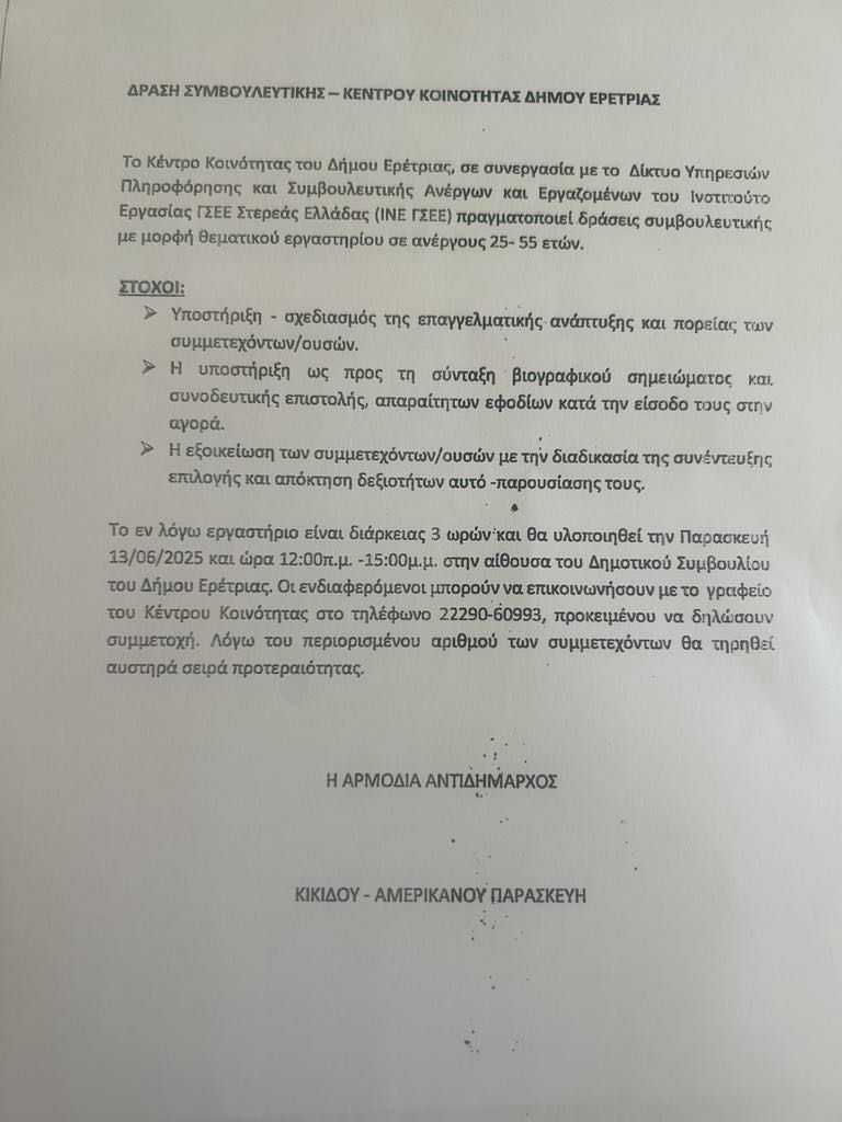 Η αρμόδια αντιδήμαρχος κα Αμερικάνου Βούλα και το Κέντρο Κοινότητας του Δήμου Ερέτριας ενημερώνουν και προσκαλούν τους ενδιαφερόμενους ανέργους κι εργαζόμενους να συμμετέχουν στην δράση επιμόρφωσης και συμβουλευτικής που θα υλοποιηθεί την Παρασκευή 13 Ιουνίου.
