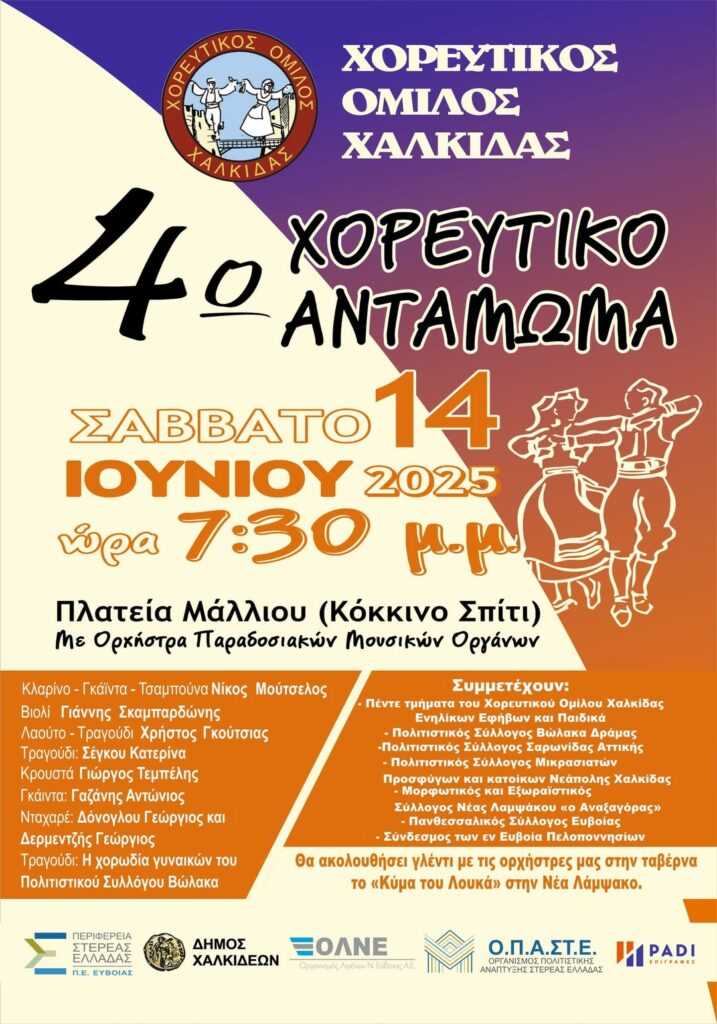 Έφτασε η ώρα για το 4ο Χορευτικό Αντάμωμα, μια συνάντηση-γιορτή παράδοσης, πολιτισμού και συνεργασίας, με στόχο τη διατήρηση και ανάδειξη των ελληνικών χορών και εθίμων που διοργανώνει ο Χορευτικός Όμιλος Χαλκίδας, όπως ενημερώνει το Δ.Σ του Ομίλου και η Πρόεδρος κα Φώτω Γιαννούλη – Βάχου