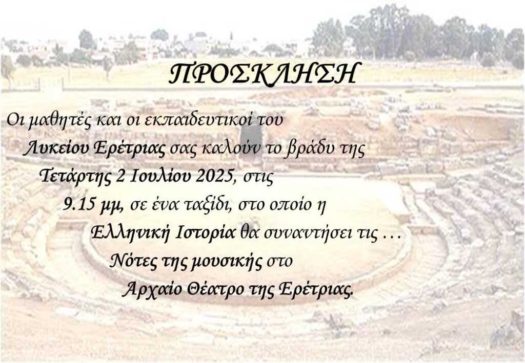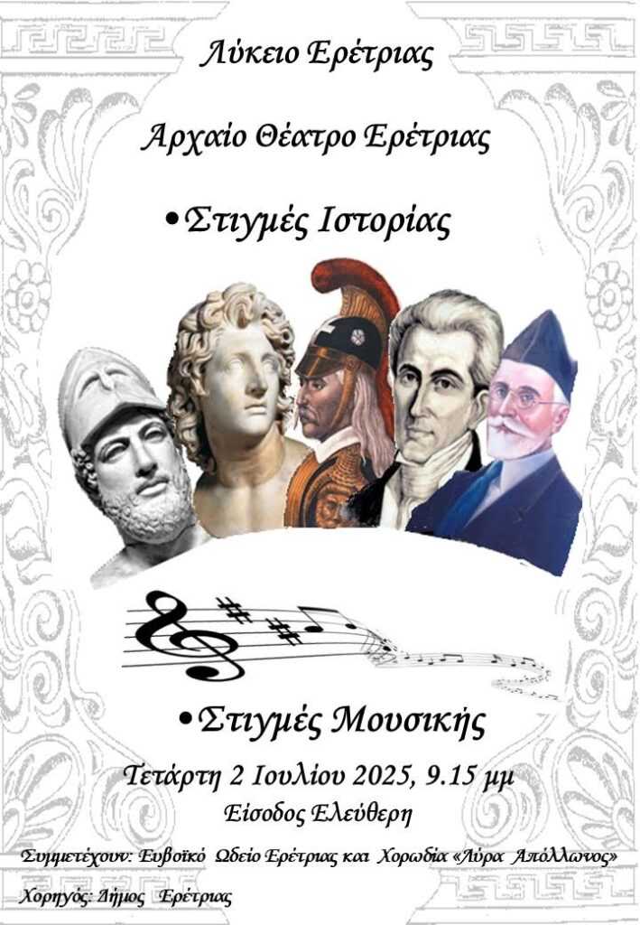Οι μαθητές και οι εκπαιδευτικοί του Λυκείου Ερέτριας διοργανώνουν ένα ταξίδι στην ελληνική ιστορία με τις Νότες της Μουσικής, που θα πραγματοποιηθεί στο αρχαίο θέατρο Ερέτριας την Τετάρτη 2, Ιουλίου 2025 στις 9:15 το βραδάκι.