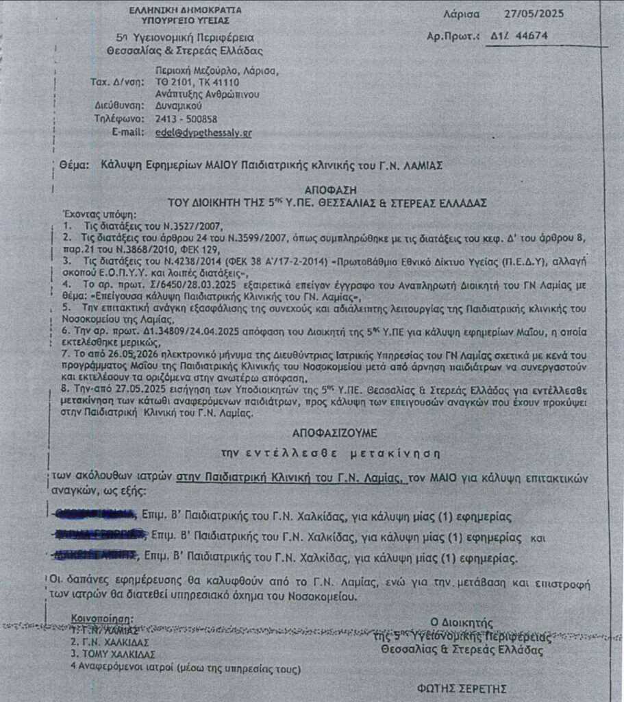 Πιο συγκεκριμένα, στις 27 Μαΐου 2025, εκδόθηκε εντέλλεσθε μετακίνησης τριών παιδιάτρων από το Γενικό Νοσοκομείο Χαλκίδας προς το Νοσοκομείο Λαμίας, για να καλύψουν εφημερίες τις τελευταίες ημέρες του μήνα. Μάλιστα η 1η εφημερία έπρεπε να εκτελεστεί στις 27/05! Η εντολή ήρθε αιφνιδιαστικά, ενώ οι εν λόγω γιατροί είχαν ήδη υπερβεί τον αριθμό των εφημεριών που είχαν πραγματοποιήσει στο Νοσοκομείο Χαλκίδας.