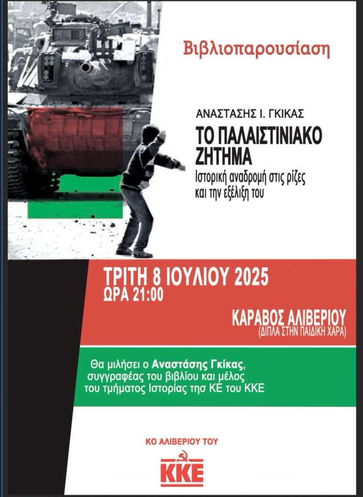 Η Κομματική Οργάνωση Αλιβερίου του ΚΚΕ, αυτή την Τρίτη 8 Ιουλίου, στις 21:00, στον Κάραβο (δίπλα στην παιδική χαρά), διοργανώνει βιβλιοπαρουσίαση της έκδοσης “Το Παλαιστινιακό ζήτημα. Ιστορική αναδρομή στις ρίζες και την εξέλιξη του”.