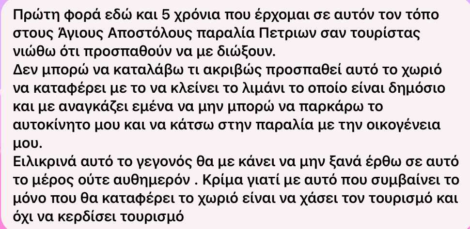 Μια καταγγελία-διαμαρτυρία έφτασε εχθές το βράδυ Πέμπτη 24 Ιουλίου 2025, στον ιστότοπο του expressevia.com σχετικά με το κλείσιμο του λιμανιού των Αγίων Αποστόλων Πετριών και την απαγόρευση της στάθμευσης των αυτοκινήτων. Τα δικά μας σχόλια είναι περιττά, μπορείτε να διαβάσετε το εν λόγο μήνυμα.