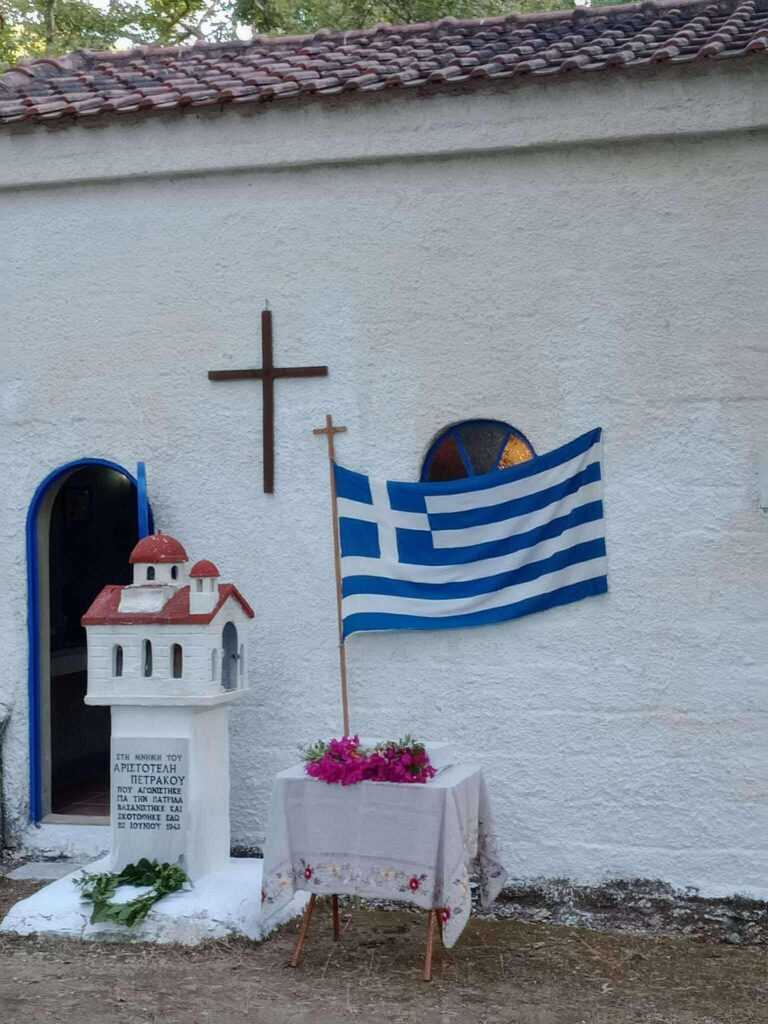 Ακολούθως, τελέστηκε επιμνημόσυνη δέηση στον αύλειο χώρο του ιερού παρεκκλησίου, εις μνήμην του ήρωος Αριστοτέλη Πετράκου, ο οποίος αγωνίστηκε για την πατρίδα, βασανίστηκε και μαρτύρησε στο ίδιο σημείο στις 22 Ιουνίου 1943.