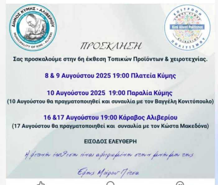 Σας περιμένουμε και φέτος, όλοι μαζί να στηρίξουμε με αφοσίωση και συνέπεια, να γίνουμε κομμάτι ενεργό στην ανάδειξη της ταυτότητας των τοπικών προϊόντων της περιοχής μας! 8 και 9 Αυγούστου στην Πλατεία της Κύμης, 10 Αυγούστου στην Παραλία της Κύμης και 16-17 Αυγούστου στον Κάραβο Αλιβερίου.