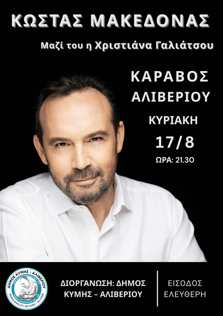 Ο σπουδαίος ερμηνευτής Κώστας Μακεδόνας, με τη χαρακτηριστική φωνή και τις μεγάλες επιτυχίες που έχουν αγαπηθεί από το κοινό, έρχεται στον Κάραβο Αλιβερίου για μια μοναδική μουσική βραδιά. Την Κυριακή 17 Αυγούστου, στις 21:30, ο αγαπημένος καλλιτέχνης θα μας ταξιδέψει με τις μελωδίες και τα τραγούδια του, χαρίζοντας στιγμές συγκίνησης και διασκέδασης.