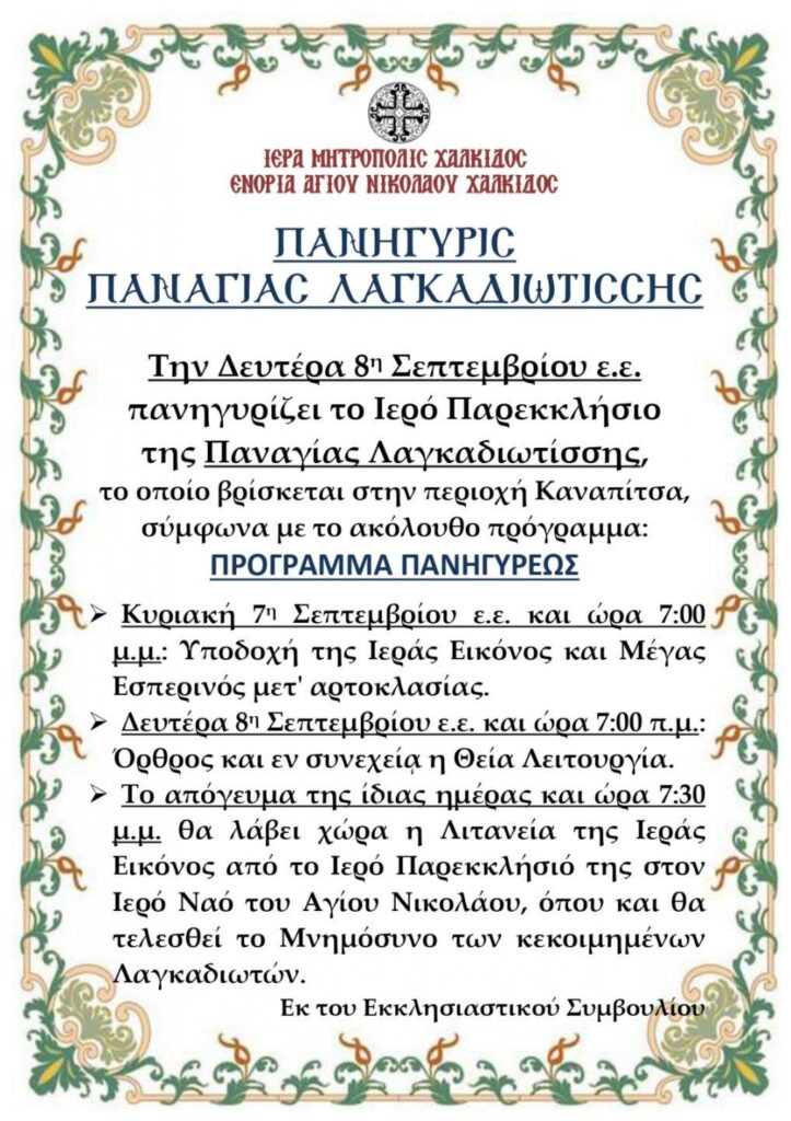 Τη Δευτέρα, 8η Σεπτεμβρίου ε.ε. πανηγυρίζει το Ιερό Παρεκκλήσιο της Παναγίας Λαγκαδιωτίσσης, το οποίο βρίσκεται στην περιοχή Καναπίτσα, σύμφωνα με το ακόλουθο πρόγραμμα: