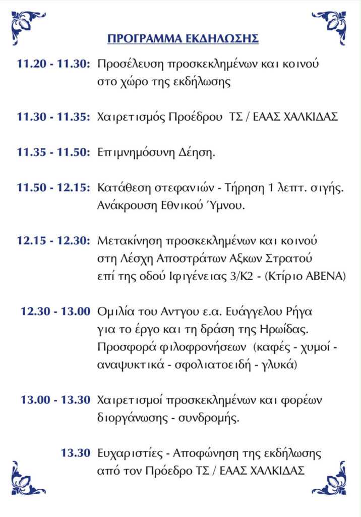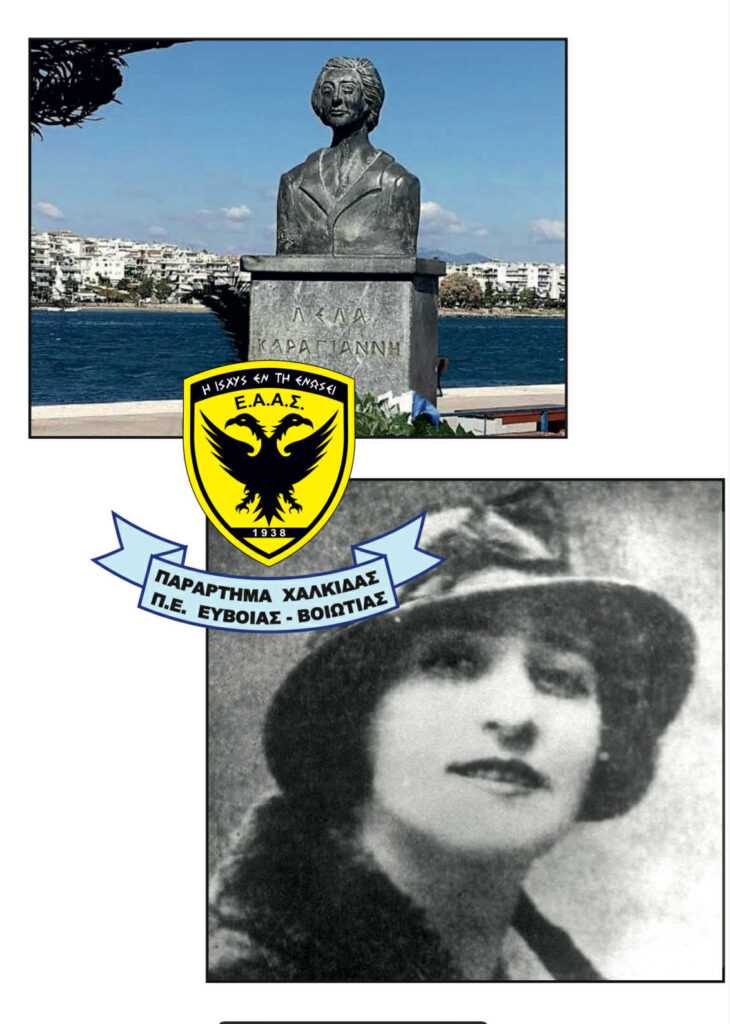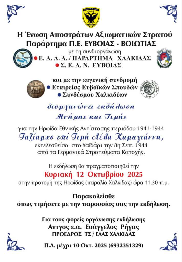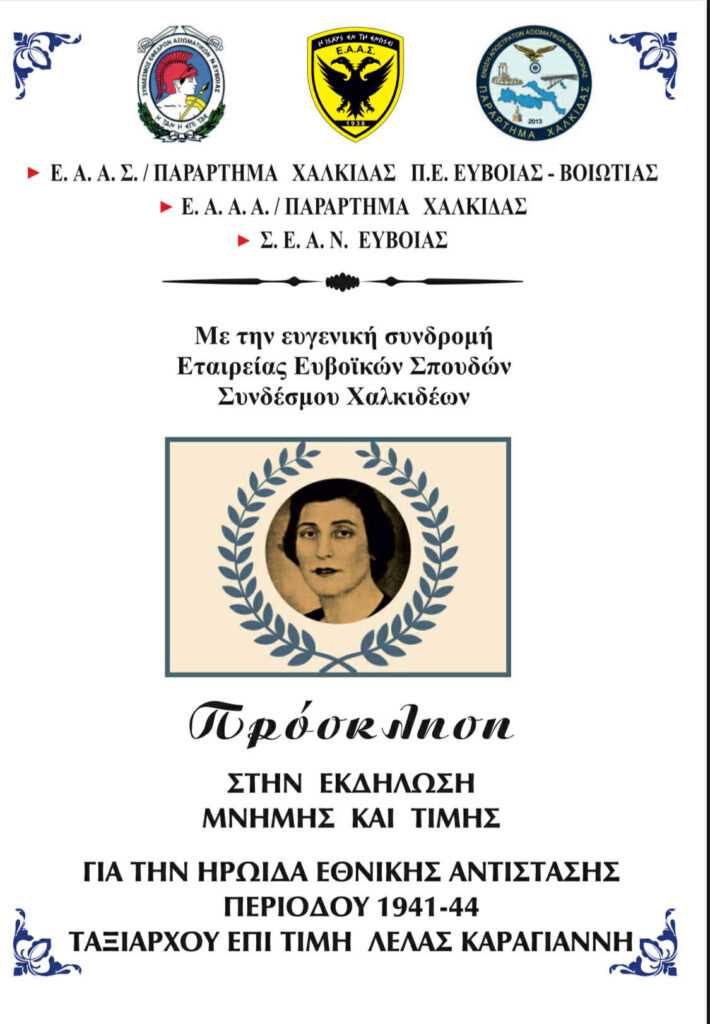 Η Ένωση Αποστράτων Αξιωματικών Στρατού Ευβοίας και Βοιωτίας, ο Πρόεδρος Αντγος ε.α. Ευάγγελος Ρήγας και τα μέλη του Παραρτήματος στη Χαλκίδα διοργανώνουν εκδήλωση και τιμούν με σεβασμό και συγκίνηση, την μνήμη της ηρωίδας της Εθνικής Αντίστασης περιόδου 1941 -1944 ”Ταξιάρχου επί Τιμή ” Λέλας Καραγιάννη, που με το θάρρος και την αυτοθυσία της έγινε σύμβολο πίστης, ελευθερίας και αγάπης για την πατρίδα. Μια εκδήλωση αφιερωμένη στη γυναίκα που ενέπνευσε και συνεχίζει να εμπνέει όλες τις γενιές που ακολουθούν με το παράδειγμά της.