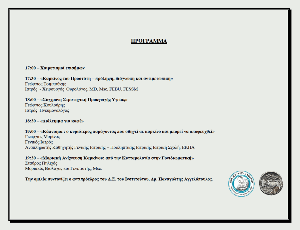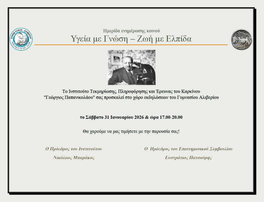 Το Ινστιτούτο Τεκμηρίωσης, Πληροφόρησης και Έρευνας του Καρκίνου «Γεώργιος Παπανικολάου»διοργανώνει ημερίδα ενημέρωσης κοινού με τίτλο «Υγεία με Γνώση – Ζωή με Ελπίδα», το Σάββατο 31 Ιανουαρίου 2026, στις 17:00 στον χώρο εκδηλώσεων του Γυμνασίου Αλιβερίου.