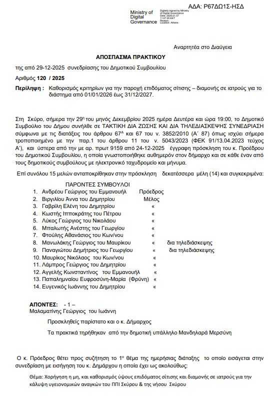 Μετά απο εισήγηση του Δημάρχου, το Δημοτικό Συμβούλιο του Δήμου Σκύρου ενέκρινε ομοφωνα τη χορήγηση μηνιαίου οικονομικού κινήτρου 600 ευρω ως επιδόμα στέγασης και σίτισης σε κατηγορίες ιατρών που υπηρετούν το 2026 ή θα υπηρετήσουν στο Πολυδύναμο Περιφερειακό Ιατρείο Σκύρου, σύμφωνα μετα κριτήρια που προβλέπει ο νόμος, με στόχο τη διασφάλιση της συνεχούς και αξιόπιστης υγειονομικής κάλυψης του νησιού!